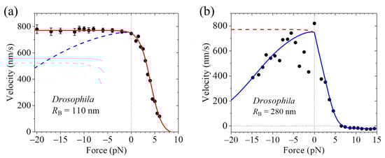 Together, the experimental results of Sozanski et al. [] showed that the velocity of the rat kinesin motor decreases sensitively with the increase in the effective viscosity, as shown in Figure 6a. In contrast, the experimental results of Nettesheim et al. [] showed that the velocity of the Drosophila kinesin motor is insensitive to the increase in the effective viscosity, as shown in Figure 6b.