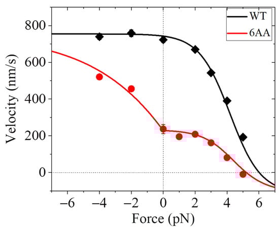 Additionally, it is noted that some optical trapping assays obtained that while for the human kinesin motor, the velocity is nearly independent on the forward load, for the corresponding mutant motor with the NL in each head being extended by adding six additional amino acids, the velocity increases as the magnitude of the forward load increases [] (Figure 4). Interestingly, some optical trapping assays obtained that for some WT members of other kinesin families, such as KIF17 dimer of kinesin-2 family and KIF15 dimer of kinesin-12 family, the velocity also increases as the magnitude of the forward load increases [,] (Figure 5).