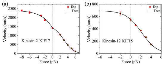 In summary, some optical trapping assays obtained that the velocity of the WT kinesin motor is nearly independent on the forward load [], as shown in Figure 3a, whereas others obtained that the velocity of the WT kinesin motor decreases as the magnitude of the forward load increases [,], as shown in Figure 3b. The optical trapping assays obtained that while for the WT human kinesin motor, the velocity is nearly independent on the forward load, for the corresponding mutant motor with the NL extension, the velocity increases as the magnitude of the forward load increases [], as shown in Figure 4. The optical trapping assays obtained that for some WT members of other kinesin families, such as KIF17 dimer of kinesin-2 family and KIF15 dimer of kinesin-12 family, the velocity also increases as the magnitude of the forward load increases [,], as shown in Figure 5.