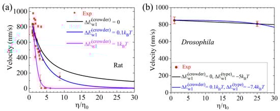 1 under no load in the absence of the crowders. The presence of the crowders increases the effective viscosity [,]. Moreover, the crowders can alter slightly the interaction of the head with MT, with the affinity Ew1 being increased by a few kBT. Either the increase in the viscosity or the increase in the affinity Ew1 can induce P0 < 1. Thus, the experimental results by Sozanski et al. [] showing that the velocity of the rat kinesin decreases significantly as the effective viscosity increases can be explained (Figure 6a) []. By considering that the affinity Ew1 for the Drosophila kinesin is smaller than that for the rat kinesin, the experimental results by Nettesheim et al. [] showing that increasing the viscosity by 25 times has only a slight influence on the velocity of the Drosophila kinesin can also be explained (Figure 6b) [].