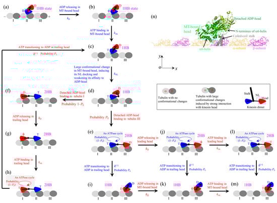 As the AMD simulation showed, in the 1HB state prior to the occurrence of the large change in the conformation of the MT-bound ATP-head, the detached ADP-head is at the leftward-, forward- and upward-biased position of the MT-bound head (Figure 7n) []. In the following, we briefly review how the model can consistently and quantitatively explain the contrasting experimental results. For convenience of writing, unless otherwise pointed out, from now on, the 1HB state refers to the one prior to the occurrence of the large change in the conformation of the MT-bound ATP-head.