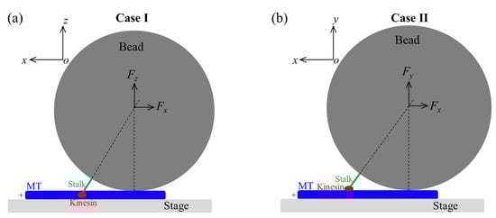 Diagram showing the relative location between the large-sized bead and kinesin motor. (a) Case I: the bead on the right side of the motor (viewed in the plus-ended direction). (b) Case II: the bead on the upper side of the motor. Seen from the kinesin motor, the coordinates defined here are the same as those in Figure 7, with the y-axis being perpendicular to the plane of the paper and outward in (a) while the z-axis being perpendicular to the plane of the paper and inward in (b).