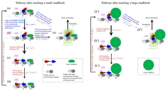 The small roadblock has no interference effect on the location of the detached head relative to the MT-bound head in the 1HB state (Figure 9a) []. Before NL docking of the MT-bound head (Figure 9a), due to the very low rate of ATP transitioning to ADP, Period I can occur with a low rate (Figure 9, transition from Figure 9a–e). After NL docking of the MT-bound head (Figure 9b), due to the high rate of ATP transitioning to ADP, Period I can occur with a high rate (Figure 9, transition from Figure 9b–e). Hence, the kinesin motor has a short residence time on MT. By contrast, the large roadblock can have an interference effect on the relative location of the detached ADP-head to the MT-bound head in the 1HB state (Figure 9a’), because the detached head is at the forward- and upward-biased position of the MT-bound head. Consequently, in the 1HB state, the detached ADP-head cannot have the high affinity for the MT-bound head (Figure 9a’) and thus the detached ADP-head can bind to the rear tubulin before the large change in the conformation of the MT-bound ATP-head associated with its NL docking (Figure 9b’). Due to the very low rate of ATP transitioning to ADP in the MT-bound head prior to its NL docking, Period I can occur with a low rate (Figure 9, transition from Figure 9a’–d’). Hence, the kinesin motor has a long residence time on MT.