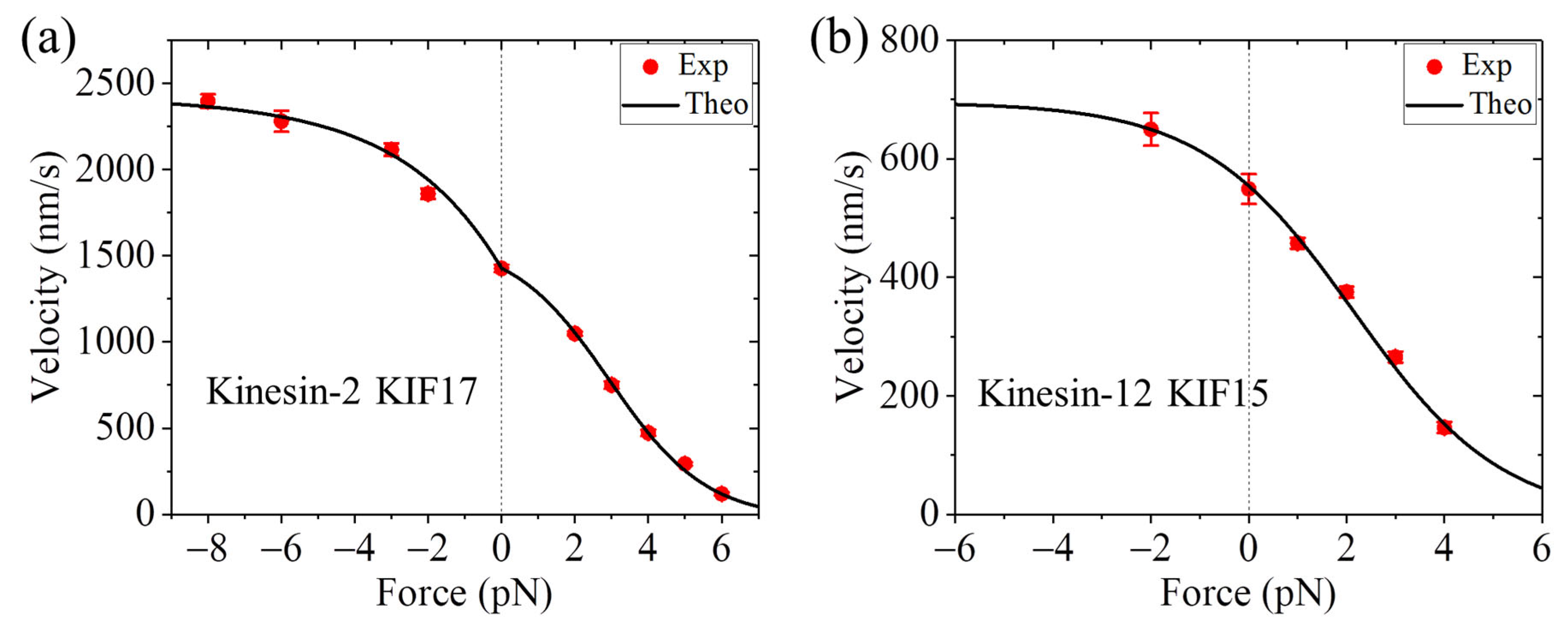 - Shi, X.; Wang, Y.; Liu, Y.; Xie, P. On load dependence of detachment rate of kinesin motor. Chin. Phys. B 2025, 34, 018702. [Google Scholar] [CrossRef]