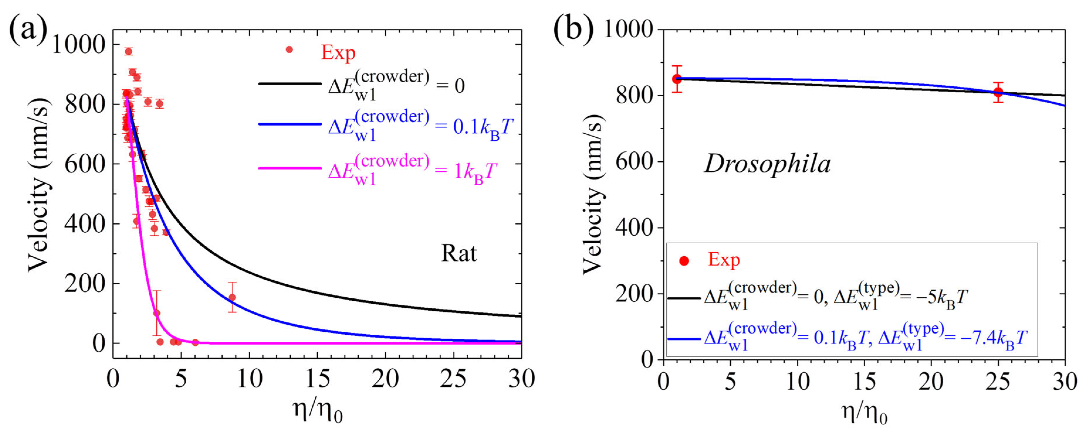 - Xie, P. Effect of small molecular crowders on dynamics of kinesin molecular motors. J. Theor. Biol. 2024, 578, 111685. [Google Scholar] [CrossRef]