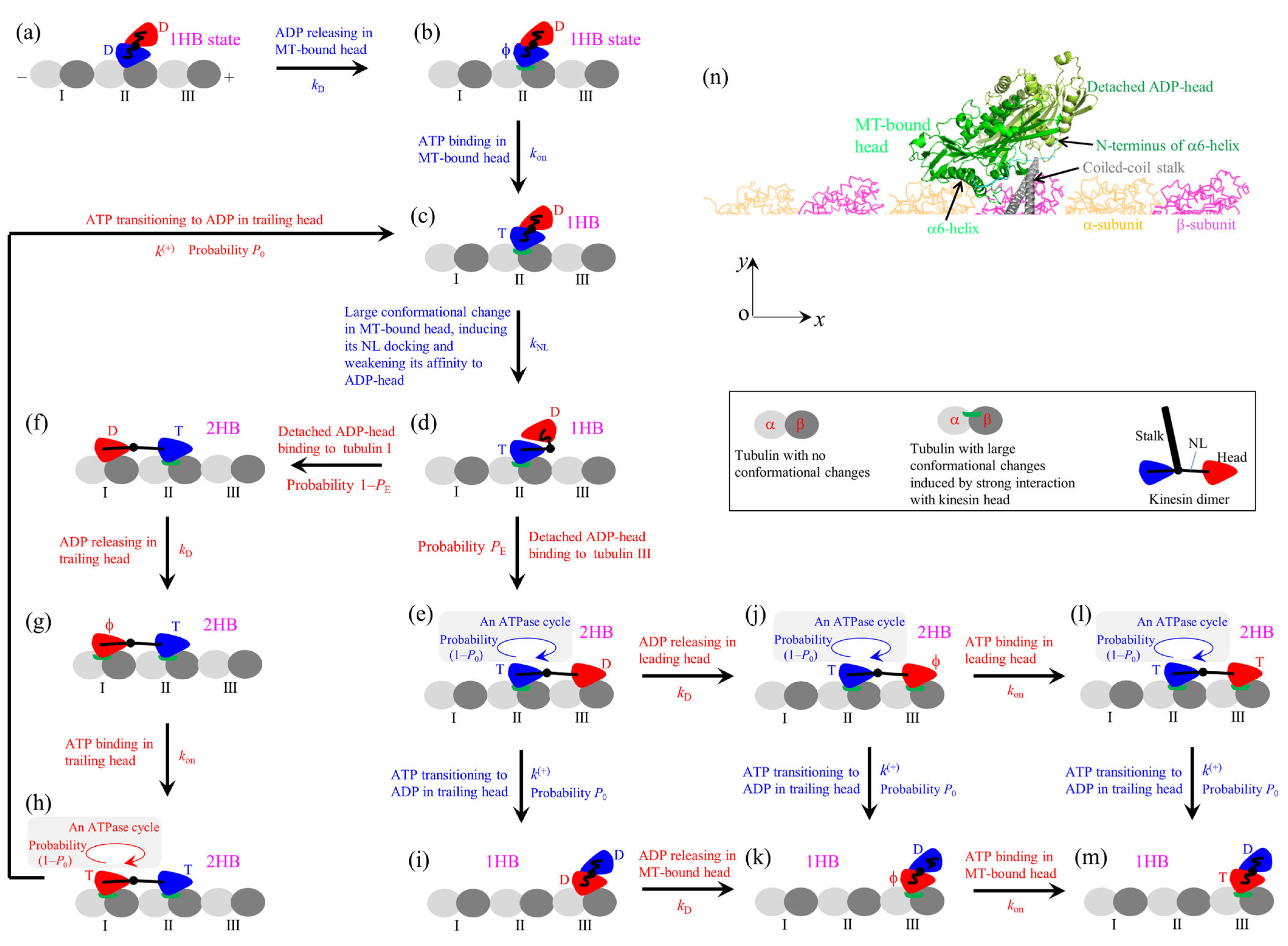 - Shi, X.-X.; Liu, Y.-R.; Xie, P. Factors determining kinesin motor in a predominant one-head-bound or two-heads-bound state during its stepping cycle. Biomolecules 2025, 15, 717. [Google Scholar] [CrossRef]