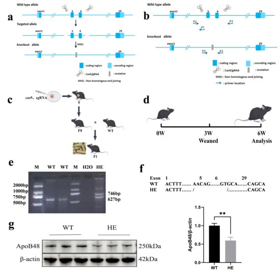 The clustered regularly interspaced short palindromic repeat (CRISPR)–Cas9 system, composed of the Cas9 nuclease and modified single-conductor ribonucleic acid (sgRNA) [], has been widely applied to the study of various diseases [,]. Gene-editing models such as Apolipoprotein E [], low-density lipoprotein receptor (LDLR) [], Perilipin 1 [], and PCSK9 [] have been successfully constructed to study lipid metabolism mechanisms. However, to date, there have been no reports of animal models with ApoB48 knockout (KO).