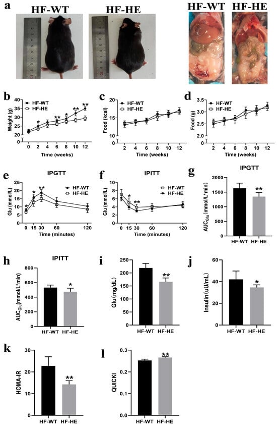Comparison of body weight and glucose between the HF-WT and HF-HE groups. (a) Gross morphology and appearance after dissection of mice following HFD. (b) Trends in body weight in the HF-WT and HF-HE groups over 12 weeks of HFD, with significant differences beginning in the 6th week (N = 8 in each group, in the 6th week: p = 0.002). (c,d) Average daily energy intake and daily food intake (N = 8 in each group). (e) Blood glucose levels at 0, 15, 30, 60, 120 min during IPGTT (N = 8 in each group, 0 min: p = 0.026, 15 min: p = 0.011, 30 min: p = 0.002, 60 min: p = 0.069, 120 min: p = 0.100). (f) Blood glucose levels at 0, 15, 30, 60, 120 min during IPITT (N = 8 in each group, 0 min: p = 0.120, 15 min: p = 0.012, 30 min: p = 0.006, 60 min: p = 0.258, 120 min: p = 0.434). (g,h) 2 h AUCGlu area under the curve of glucose (N = 8 in each group, p = 0.003, p = 0.017). (i,j) Fasting blood glucose and fasting blood insulin after 12 weeks of HFD (N = 8 in each group, p < 0.001, p = 0.020). (k,l) HOMA-IR and QUICKI of mice fed the HFD for 12 weeks (N = 8 in each group, p < 0.001, p < 0.001). Different labels over bars denote a significant difference. * p < 0.05, ** p < 0.01, compared with the HF-WT group.