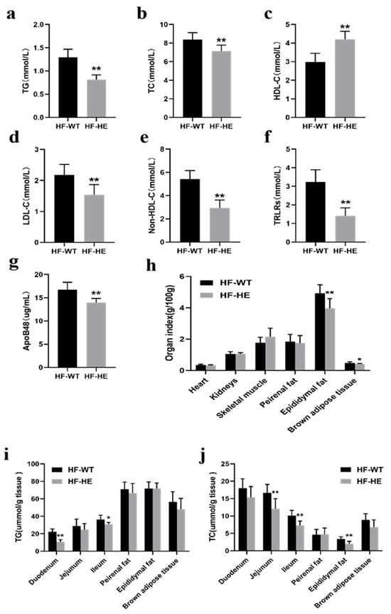 Lipid metabolism in the HF-WT and HF-HE groups. (a) TG (p = 0.003), (b) TC (p < 0.001), (c) HDL-C (p < 0.001), (d) LDL-C (p = 0.002), (e) non-HDL-C (p < 0.001), (f) TRLR (p < 0.001) levels in mouse serum (N = 8 in each group). (g) Serum ApoB48 level (p < 0.001, N = 8 in each group). (h) Heart (p = 0.752), kidney (p = 0.941), skeletal muscle (p = 0.116), perirenal fat (p = 0.726), epididymal fat (p = 0.006), and brown adipose tissue weight (p = 0.027) (N = 8 in each group). (i,j) TG and TC levels across tissues (N = 8 in each group). TG: duodenum p < 0.001, jejunum p = 0.294, ileum p = 0.012, epididymal fat p = 0.382, perirenal fat p = 0.978, brown adipose tissue p = 0.194. TC: duodenum p = 0.082, jejunum p = 0.004, ileum p = 0.001, epididymal fat p = 0.881, peirenal fat p = 0.001, brown adipose tissue p = 0.052. Different labels over bars denote a significant difference. * p < 0.05, ** p < 0.01, compared with HF-WT group.