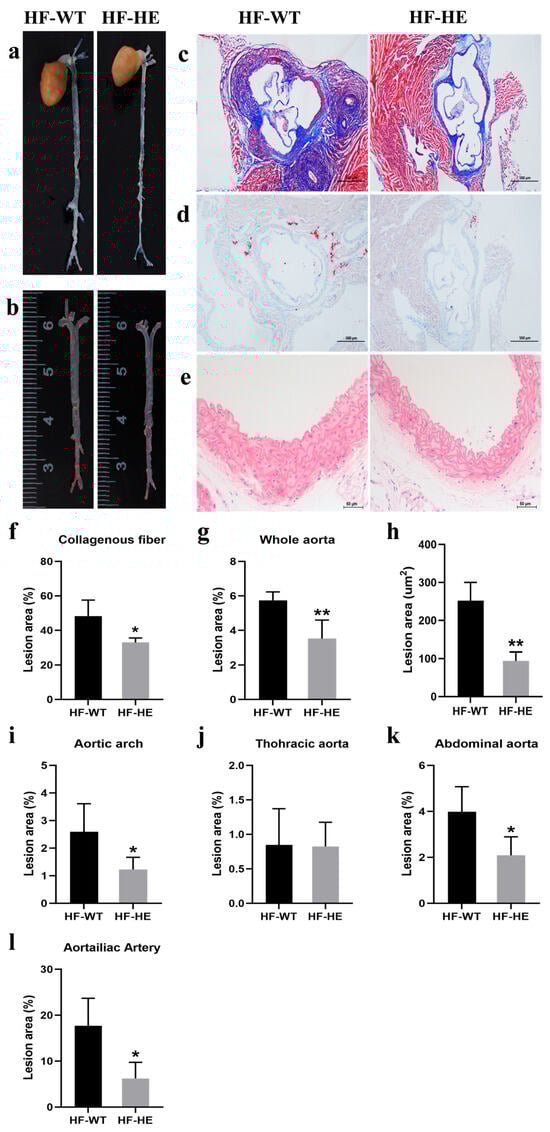 Masson staining of the aortic sinus showed that, in the HF-WT group, the overall arrangement of collagen fibres was more disordered (Figure 4c). The collagen fibre content in the HF-WT group reached 48%. In contrast, this was only 33% in the HF-HE group (p = 0.019) (Figure 4f). ORO staining also revealed significantly more red lipid droplets in the HF-WT group, approximately three times more than in the HF-HE group (Figure 4d,h). Vascular HE staining showed that the vascular wall thickness and extracellular matrix were relatively lower in the HF-HE group than in the HF-WT (Figure 4e). Differences were observed in the atherosclerotic plaques between the two groups, particularly in the abdominal and aortoiliac aortas (Figure 4g,i–l).