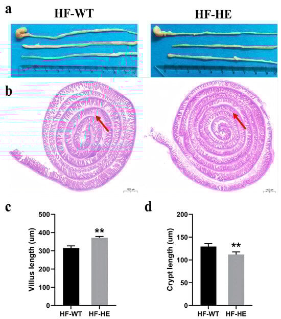 Intestinal tissue in the HF-WT and HF-HE groups. (a) Appearance and length in the HF-WT and HF-HE groups. (b) Entire intestinal tissue with HE staining. The position of the arrows indicated that in the HF-WT group, the arrangement of villi was more disordered and looser, the gaps increased, the loss was obvious, and the base of villi became shallower (scale bar: 1000 μm). (c,d) Villus length and crypt length in groups HF-WT and HF-HE. (p < 0.001, p = 0.007, N = 4 in each group). Different labels over bars denote a significant difference. ** p < 0.01, compared with the HF-WT group.