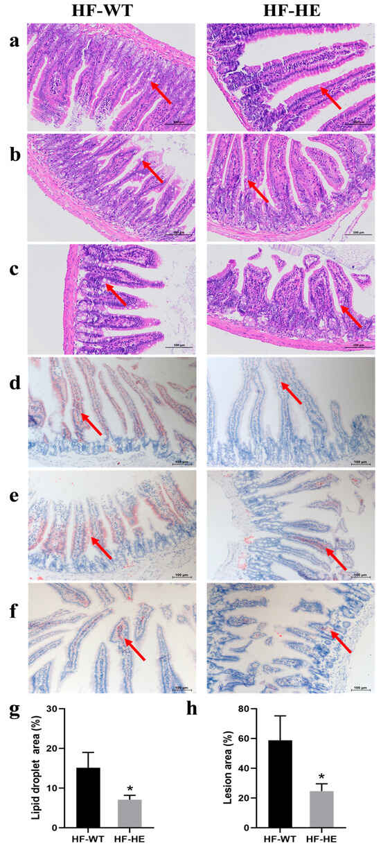 The small intestine was further stained in segments. H&E staining (Figure 6a–c) demonstrated that lipid droplet vacuoles (arrows) were more obvious in the HF-WT group than in the HF-HE group, especially in the jejunum and ileum (Figure 6b,c). The morphology of the intestinal villi in the HF-WT group was significantly abnormal, with some epithelial cell shedding. Increased inflammatory cell infiltration. ORO staining (Figure 6d–f) revealed that red lipid deposition was higher in the HF-WT group than in group HF-WE. The proportion of lipid droplet deposition was quantitatively analysed, and a significant difference was observed between the HF-WT group and the HF-HE group (Figure 6g–h).