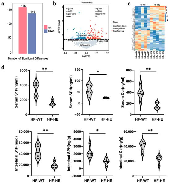 Quantitative and correlation analysis of differential metabolites. (a) Histogram of differential metabolites. (b) Volcano plot of spectral features with fold change > 1.5. (c) Hierarchical clustering. (d) Differences in metabolites in serum and intestinal tissues (p = 0.002, p = 0.017, p = 0.004, p = 0.002, p = 0.013, p = 0.002, N = 5 biologically independent experiments). All values are expressed as mean ± SD, * denotes p < 0.05 HF-HE vs. HF-WT, ** denotes p < 0.01 HF-HE vs. HF-WT. Parameters between the two groups were compared using Student’s t-test.