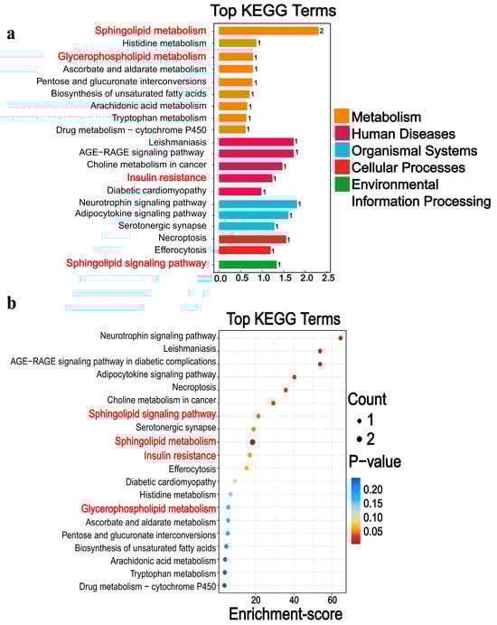 Differential metabolic pathways were screened by KEGG. (a) The 20 pathways with the lowest p-value. (b) The 20 pathways with the largest enrichment score. Differential metabolites are mainly involved in five broad categories. The main downregulation pathways include, among others, sphingolipid metabolism, insulin resistance, glycerophospholipid metabolism, and histidine metabolism. The red font denotes the relevant pathways of sphingomyelin metabolism.