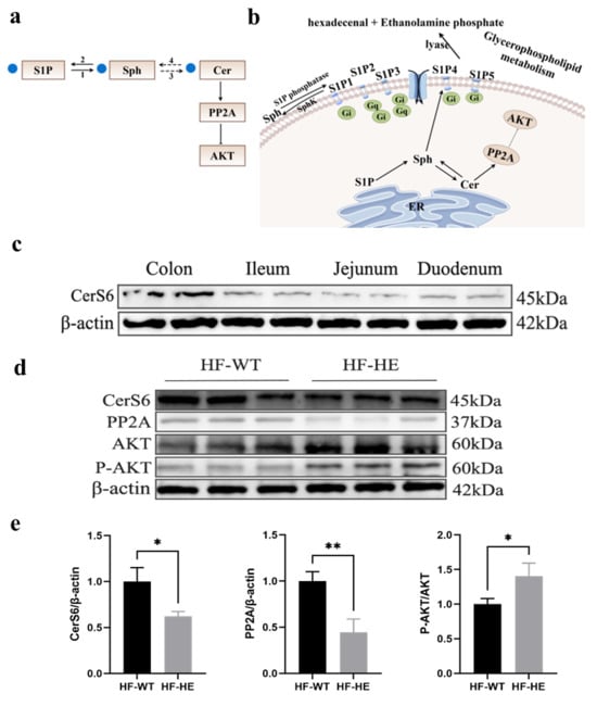 (a,b) Flow chart and simplified diagram of sphingolipid metabolism; blue dots represent significantly downregulated differential metabolites. S1P, sphingosine-1-phosphate; SPH, sphingosine; Cer, ceramide; PP2A, protein phosphatase-2A; 1, sphingosine-1-phosphate phosphatase; 2, SphK, sphingosine kinase; 3, ceramide synthase; 4, CDase, ceramidase. (c) The protein expression of CerS6 in different parts of the intestine in HF-HE (N = 2 in each tissue). (d,e) Changes in the expression levels of CerS6/PP2A/AKT signalling pathway proteins in the intestine (N = 3 in each group, CerS6: p = 0.015, PP2A: p = 0.005, AKT: p = 0.026). * denotes p < 0.05 HF-HE vs. HF-WT, ** denotes p < 0.01 HF-HE vs. HF-WT. Parameters between the two groups were compared using Student’s t-test. Original Western blot images can be found in Supplementary Figures S5 and S6.