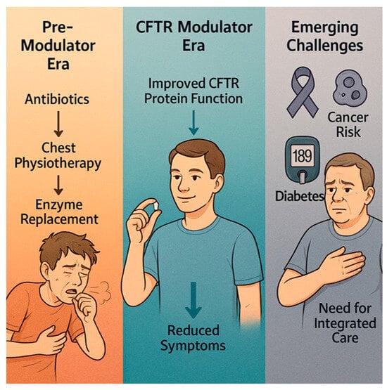 The landscape of CF treatment and understanding has fundamentally changed in recent years, largely thanks to the advent of highly effective CFTR modulators. These therapies have revolutionized the prognosis for many patients, significantly improving lung function, reducing exacerbations, and extending lifespan. However, as survival extends into older age groups, a new and more complex picture has emerged, revealing systemic effects and complications that were previously underappreciated [53].