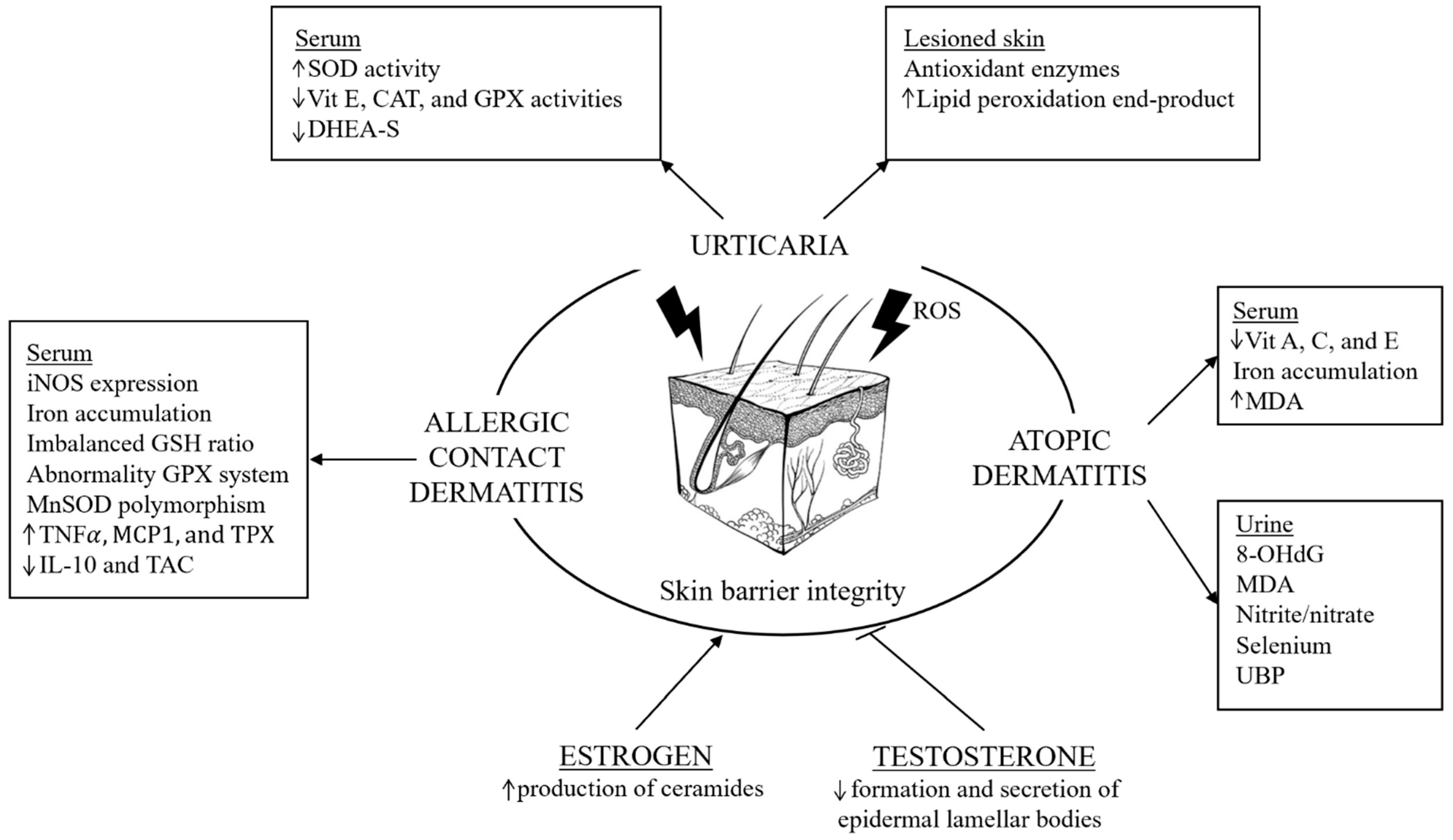 Oxidative stress is a crucial event in chronic spontaneous urticaria (CSU), whose etiology is still unknown. CSU in characterized by the appearance of wheals and angioedema that persist for at least 6 weeks, without a specific cause [84]. The finding of high IgE antibodies, the high rate of association with Hashimoto’s thyroiditis, and an increased incidence of IgG antibodies directed to the FceRIa in a subpopulation of patients have supported the autoimmune hypothesis [85]. The activity of antioxidant enzymes and the level of lipid peroxidation end-product were found to be notably increased in the lesioned skin of CSU patients, as compared with the skin of healthy subjects. Indeed, it has been demonstrated that mast cells and basophils are capable of generating superoxide anion, which may regulate the process of activation and the release of cellular mediators in both physiological and pathological conditions [86]. An interesting study has analyzed the activities of manganese SOD, copper–zinc SOD, GPX, and CAT as indices of enzymatic antioxidant capacity, as well as MDA level as a lipid peroxidation marker in plasma and erythrocytes from CSU female patients with positive or negative response to autologous serum skin test without reporting statistically significant differences [87]. The unbalanced oxidant/antioxidant homeostasis has been more frequently reported in patients showing physical urticaria. Indeed, compared with controls, a decrease in plasma vitamin E, CAT, and GPX activities, and an increase in SOD activity and plasma polyunsaturated fatty acids, were registered [88]. These alterations may lead to an increased percentage of peroxidable compounds in the skin that make the cell more susceptible to oxidative agents (UV), explaining the patients’ urticarial response to stimuli. The reduction in vitamin E levels is probably due to the consumption during the lipoperoxidation process in cell membranes. Its replacement decreases the erythema response to UV, and its effect is enhanced when combined with ascorbic acid [89]. Experimental studies on mice confirmed the effect of supplementation of vitamin E on the cell-mediated immunity and cytokine production from Th1 lymphocytes to the detriment of those released by Th2 lymphocytes [90]. Elevated SOD activity observed in some patients represents an adaptative response to ROS overproduction. Converting the first product of one-electron reduction in molecular oxygen to hydrogen peroxide, which is subsequently removed by CAT, GPX, and metallothionein, SOD is considered the first line of defense against the damage of ROS [91].