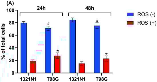 The flow cytometry analysis showed that the percentage of ROS-positive cells was greater in T98G cells than in 1321N1 cells at both 24 h and 48 h of culture (Figure 4A–E).