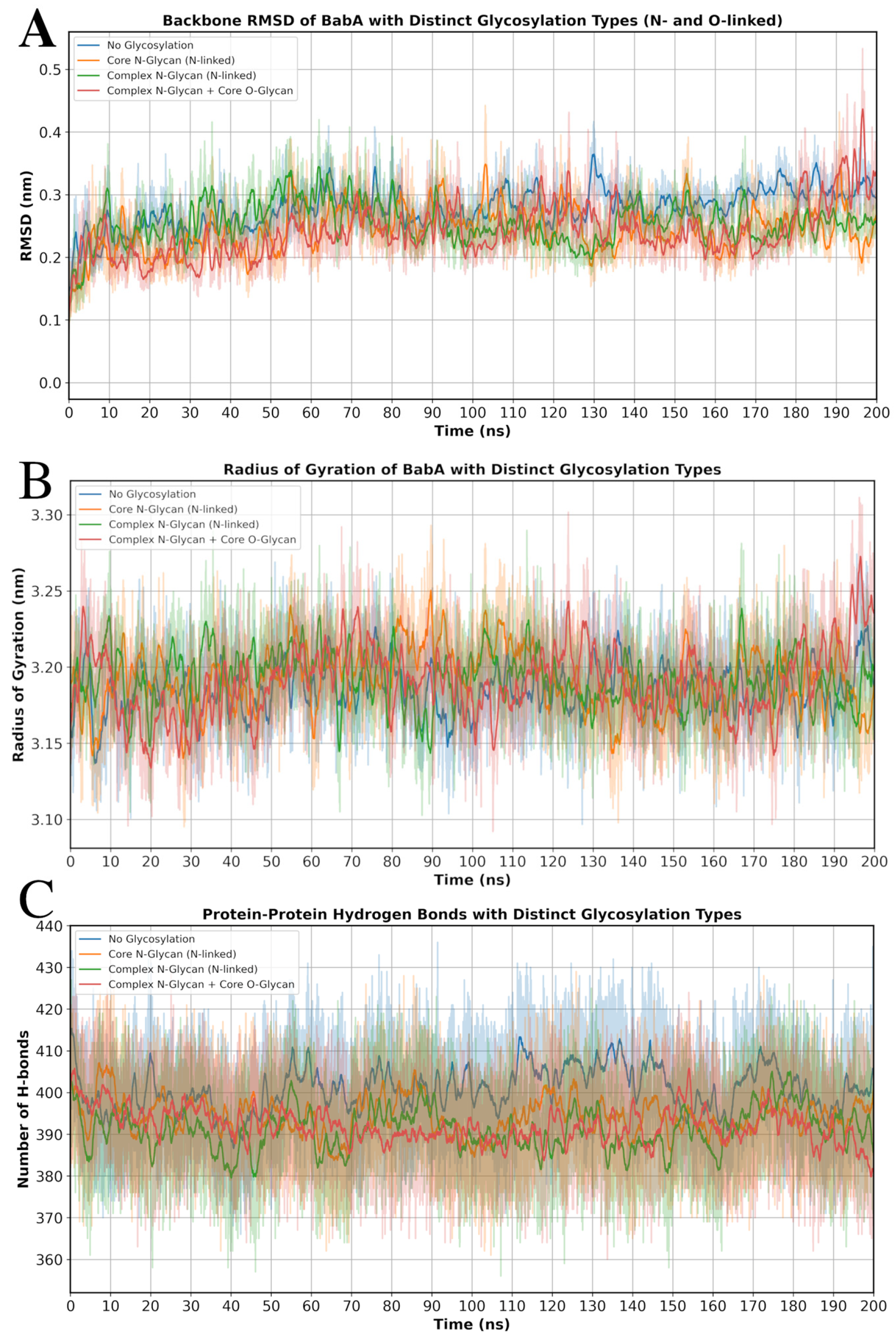 3.5. Molecular Dynamics Simulations of Glycosylated Versions and Non-Glycosylated BabA