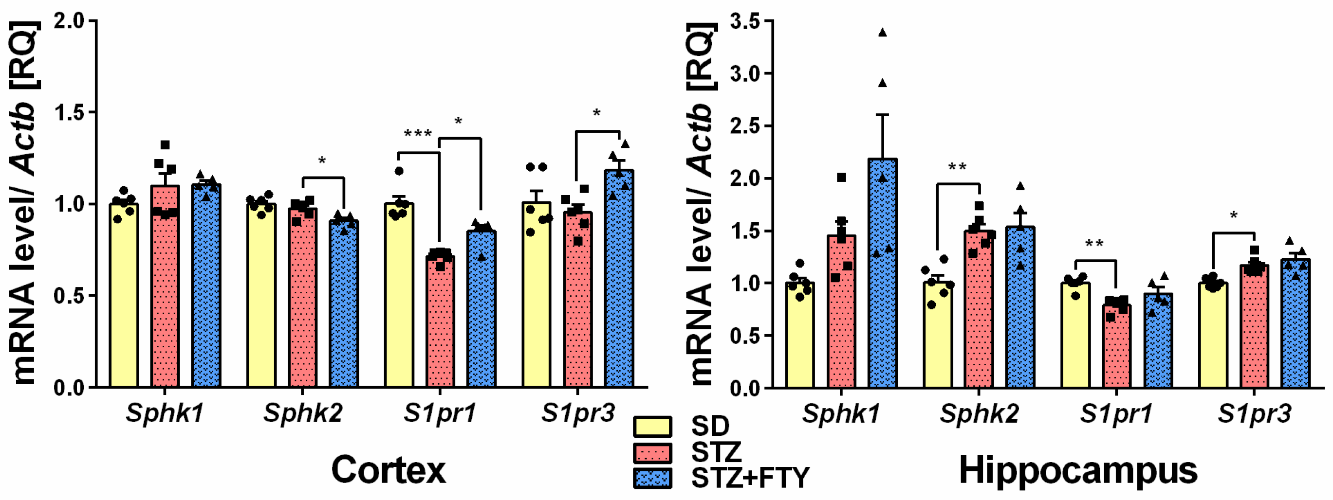 3.2.1. Gene Expression of Sphingosine Kinases and S1P Receptors in the Brain Cortex and Hippocampus of Diabetic Mice