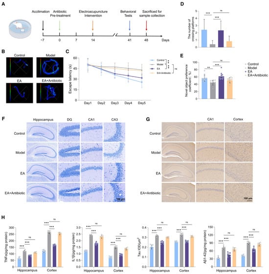 - Jiang, J.; Liu, H.; Wang, Z.; Tian, H.; Wang, S.; Yang, J.; Ren, J. Electroacupuncture could balance the gut microbiota and improve the learning and memory abilities of Alzheimer’s disease animal model. PLoS ONE 2021, 16, e0259530. [Google Scholar] [CrossRef]