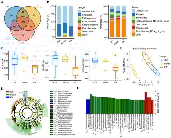 3.2. EA Alters Gut Microbial Diversity to Restore Microbiome Balance in AD Model