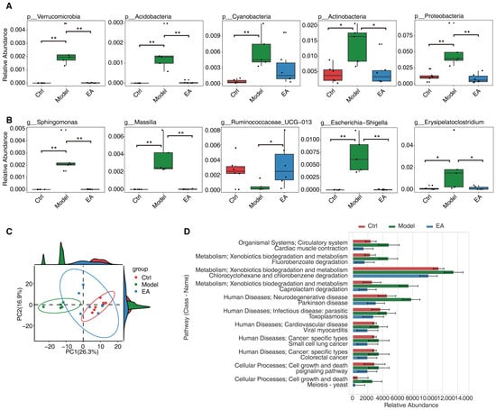 3.3. EA Restores Gut Microbial and Functional Imbalances in AD Model