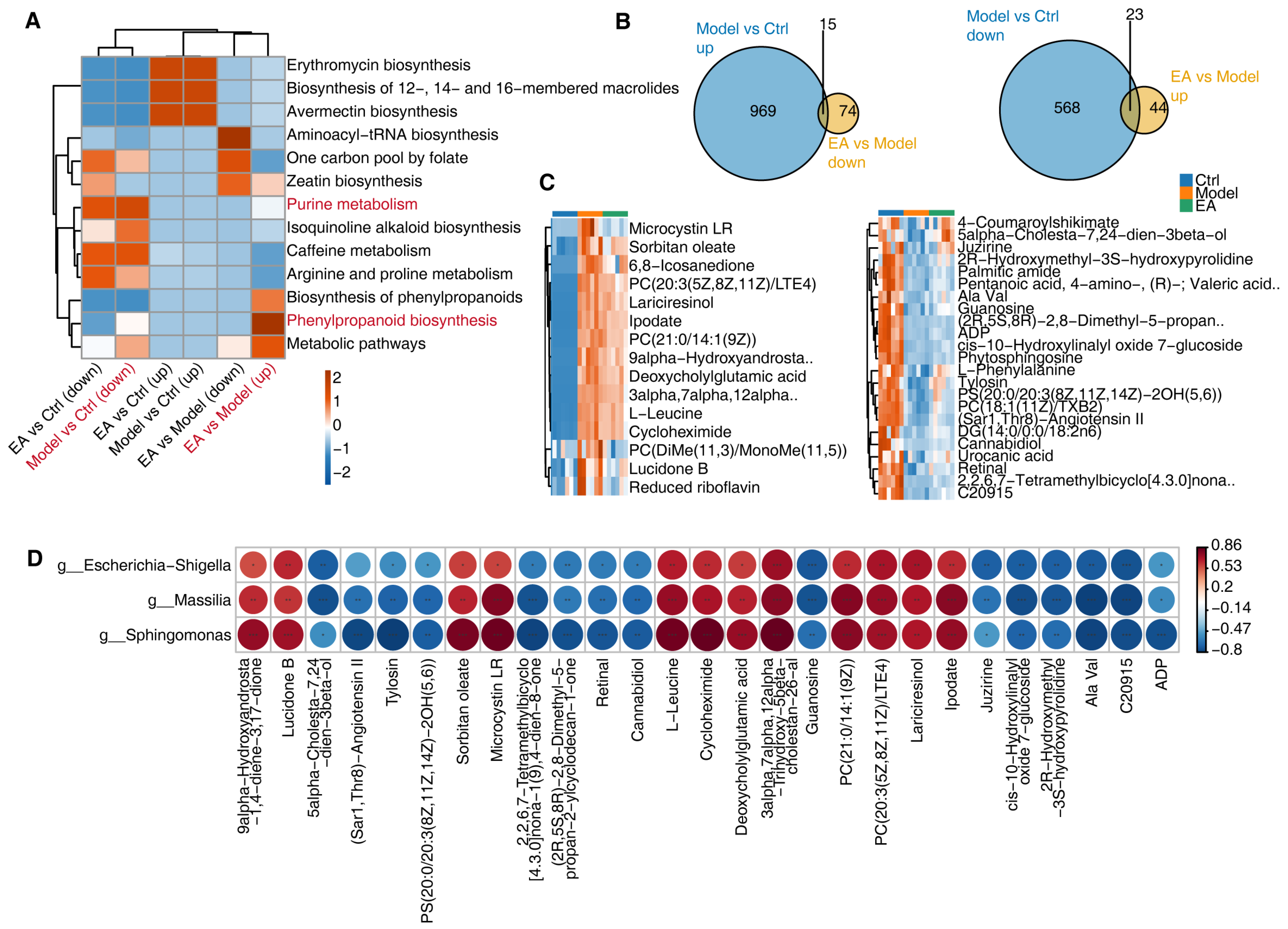 3.5. Correlation Analysis of Metabolites and Gut Microbiota and Regulatory Mechanisms of EA