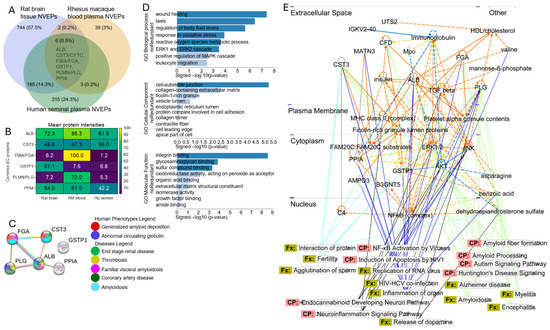 3.6. Protein–Protein Interactome (PPI) Network and Functional Enrichment of Common Human–Rat–Rhesus Proteins Associated with NVEPs