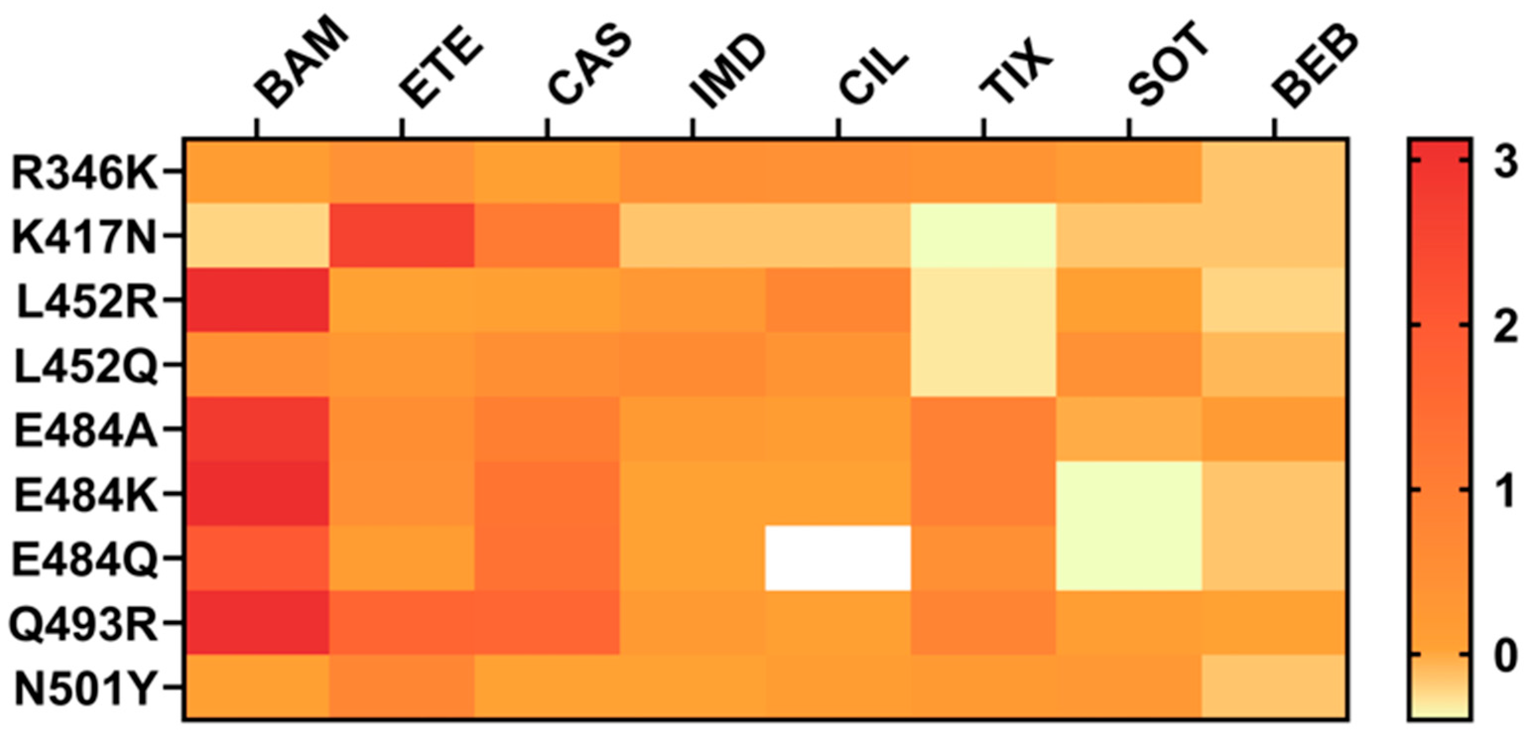 Figure 1. Fold change values in neutralization by single escape mutations against therapeutic mAbs. These values were compiled from multiple independent studies curated in the Stanford Coronavirus Resistance Database (CoV-RDB; https://covdb.stanford.edu). As experimental conditions (e.g., assay types, viral backbones, antibody formats) vary across studies, these values may not be directly comparable. Values are presented to highlight general resistance trends rather than precise quantitative differences. BAM: bamlanivimab, ETE: etesevimab, CAS: casirivimab, IMD: imdevimab, CIL: cilgavimab, TIX: tixagevimab, SOT: sotrovimab, BEB: bebtelovimab.
