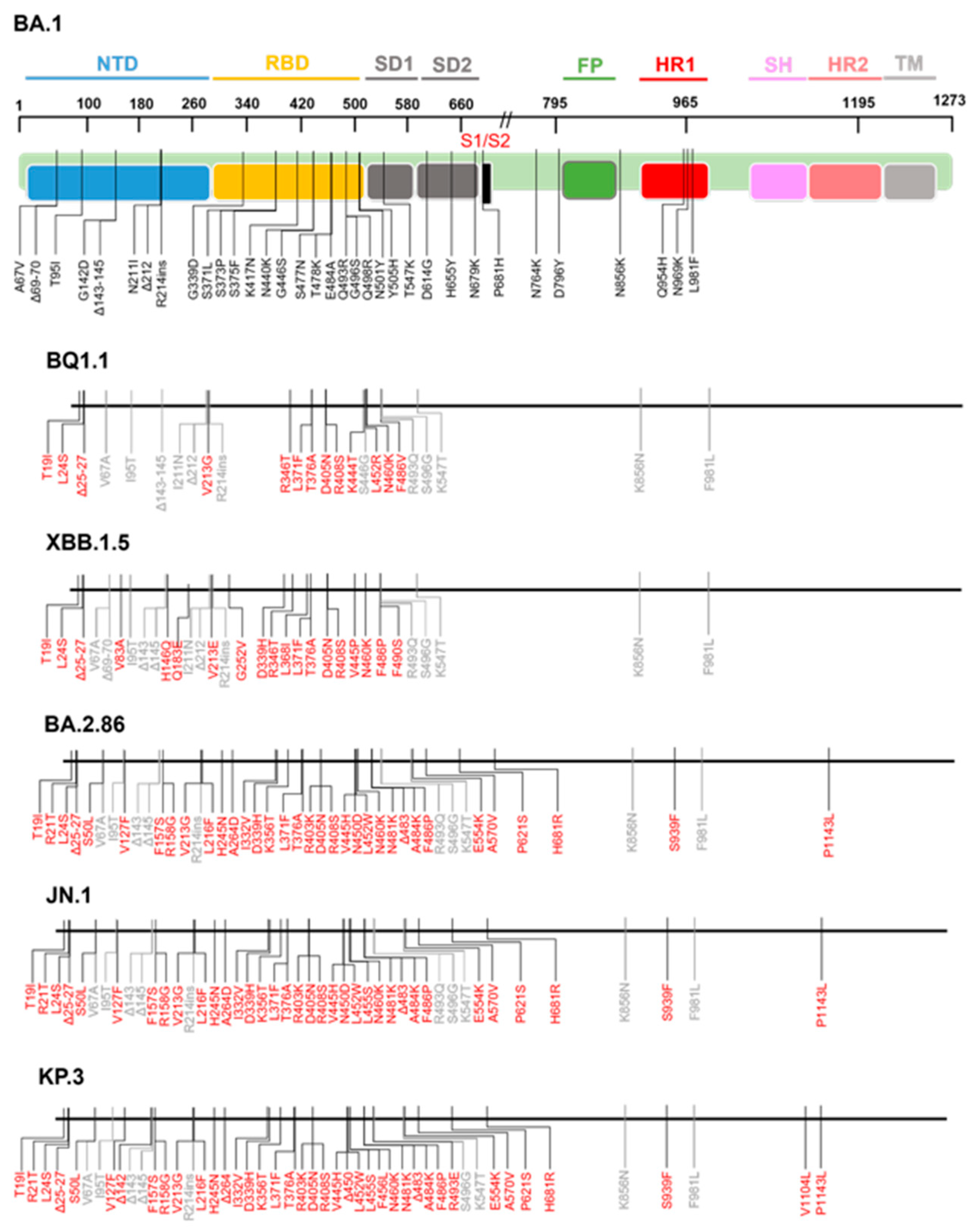 Figure 2. The mutational landscape of the Omicron spike protein. The amino acid modifications are indicated in comparison to the reference Omicron-BA.1 sequence. Consensus sequences of the spike protein were built using CoV-RDB. Amino acid substitutions are shown relative to BA.1. Residues that differ from BA.1 are highlighted in red. For positions where BA.1 already carries a substitution, the change is indicated relative to BA.1.