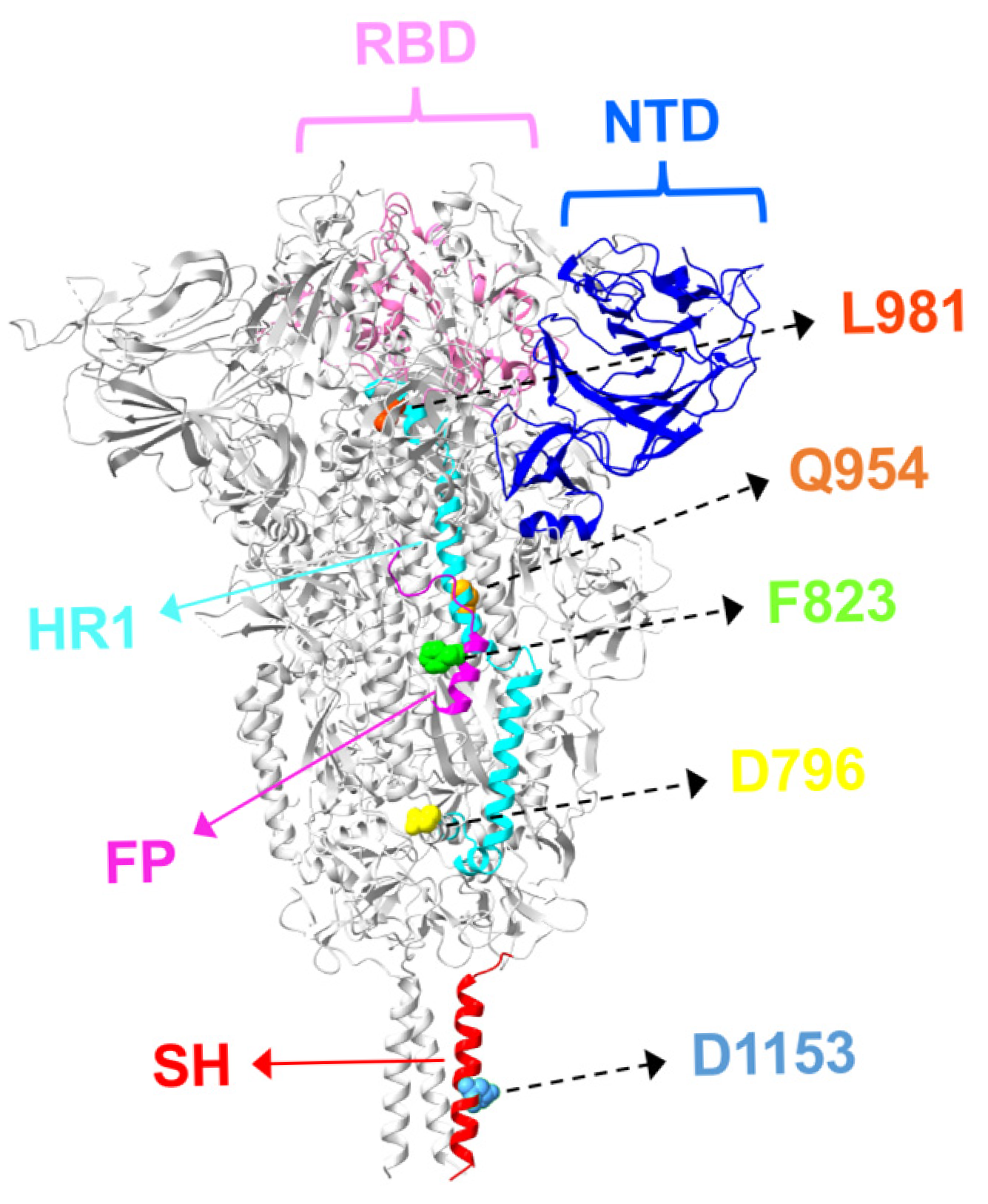 Figure 3. Structural overview of S2 mutations on antibody resistance in SARS-CoV-2. The structure of the SARS-CoV-2 spike trimer was obtained from the Protein Data Bank (PDB ID: 6XR8). Positions of key S2 subunit mutations associated with antibody resistance are displayed as spheres and color-coded: D796 (yellow), F823 (lime), Q954 (orange), L981 (orange-red), D1153 (light blue), NTD (residues 14–305, blue), RBD (residues 333–527, pink), FP (residues 816–835, magenta), HR1 (residues 906–986, cyan), and SH (residues 1137–1162, red).