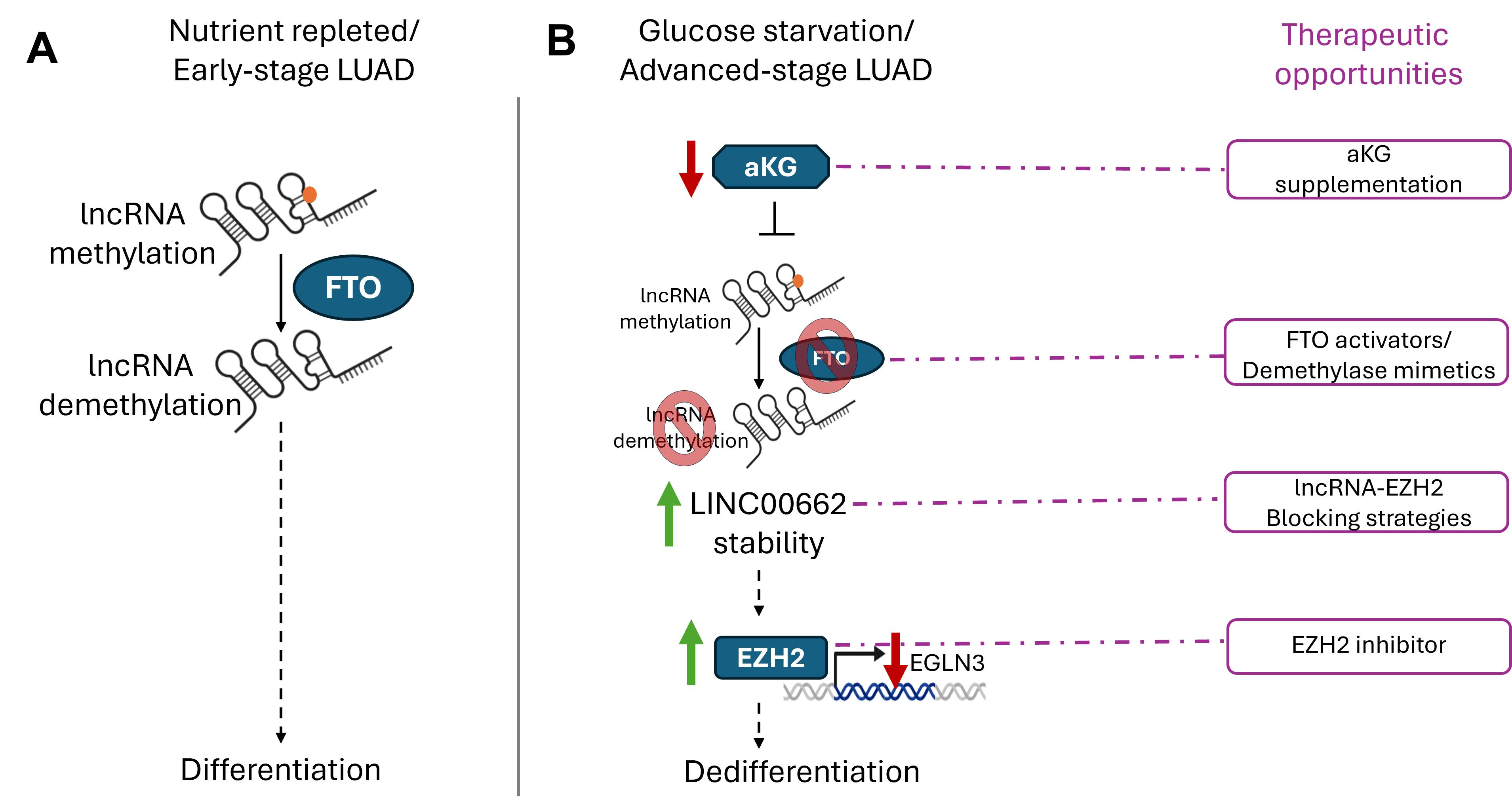 Pandey A, Saggese P, Soto A, Gomez E, Alcaraz M Jr., Scafoglio C. Long Non-Coding RNAs Contribute to Glucose Starvation-Induced Dedifferentiation in Lung Adenocarcinoma. Biomolecules. 2025; 15(11):1493. https://doi.org/10.3390/biom15111493