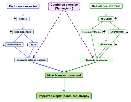 Protective effects of exercise intervention against cisplatin-induced muscle atrophy. Endurance exercise enhances mitochondrial biogenesis via PGC-1α, reduces ROS and inflammation, and restores metabolic balance. Resistance exercise activates Akt/mTOR signaling, promotes protein synthesis, inhibits degradation and excessive autophagy, leading to anabolic dominance. Combined exercise exerts synergistic benefits by integrating metabolic restoration and anabolic signaling. Together, these effects preserve muscle mass and attenuate cisplatin-induced atrophy. Arrows indicate regulation: ↑ upregulation/activation; ↓ downregulation/inhibition. Blue lines represent endurance pathways, green lines resistance pathways, and purple dashed lines synergistic interactions. PGC-1α, peroxisome proliferator-activated receptor gamma coactivator 1-alpha; ROS, reactive oxygen species; Akt, protein kinase B; mTOR, mechanistic target of rapamycin.