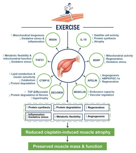 Role of exercise-induced myokines in counteracting cisplatin-induced muscle atrophy. The schematic illustrates how exercise promotes the release of multiple myokines from skeletal muscle, including Irisin, IL-15, BDNF, FGF21, Apelin, Decorin, CTRP15 (Myonectin), and Musclin. These myokines exert distinct biological effects by regulating mitochondrial biogenesis, protein turnover, metabolic flexibility, angiogenesis, and regenerative processes. Downstream, they converge on six protective mechanisms: inflammation and oxidative stress, protein synthesis, protein degradation, regeneration, angiogenesis, and metabolic flexibility, ultimately leading to reduced cisplatin-induced muscle atrophy and preserved muscle mass and function. ↑ indicate stimulation or increase; ↓ indicate reduction or suppression; ⊣ represent inhibition of signaling pathways. IL-15, interleukin-15; BDNF, brain-derived neurotrophic factor; FGF21, fibroblast growth factor 21; CTRP15, C1q/TNF-related protein 15 (Myonectin); AMPK, AMP-activated protein kinase; PGC-1α, peroxisome proliferator-activated receptor gamma coactivator-1α; TGF-β, transforming growth factor-beta.