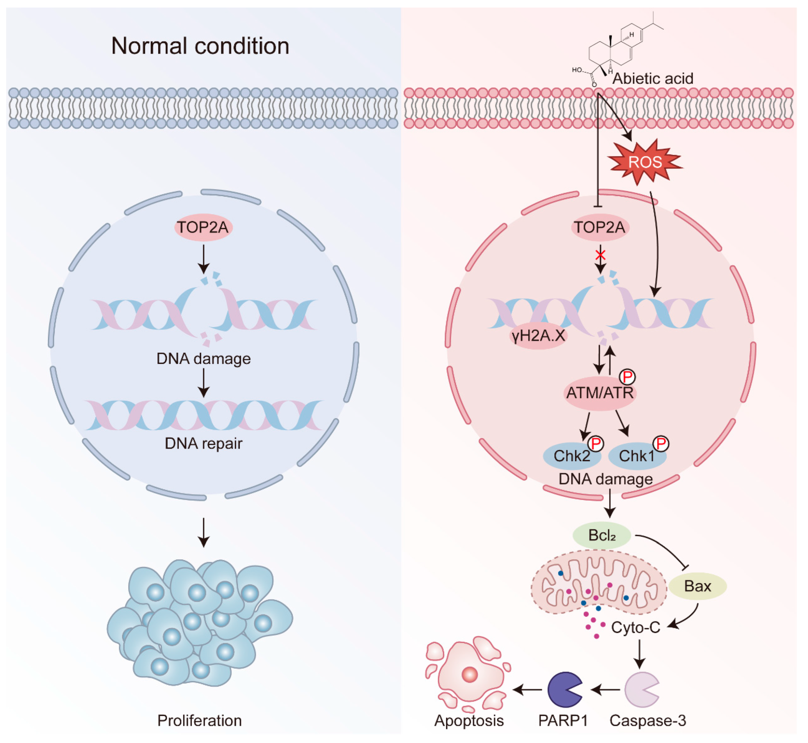 Zhu, Z.; Gu, J.; Liao, Z.; Chen, M.; Wang, Y.; Song, J.; Xia, J.; Sui, X.; Lin, S.; Sun, X. Abietic Acid Induces DNA Damage and Cell Apoptosis in Lung Cancer Cells Through Targeting TOP2A. Biomolecules 2025, 15, 1498. https://doi.org/10.3390/biom15111498