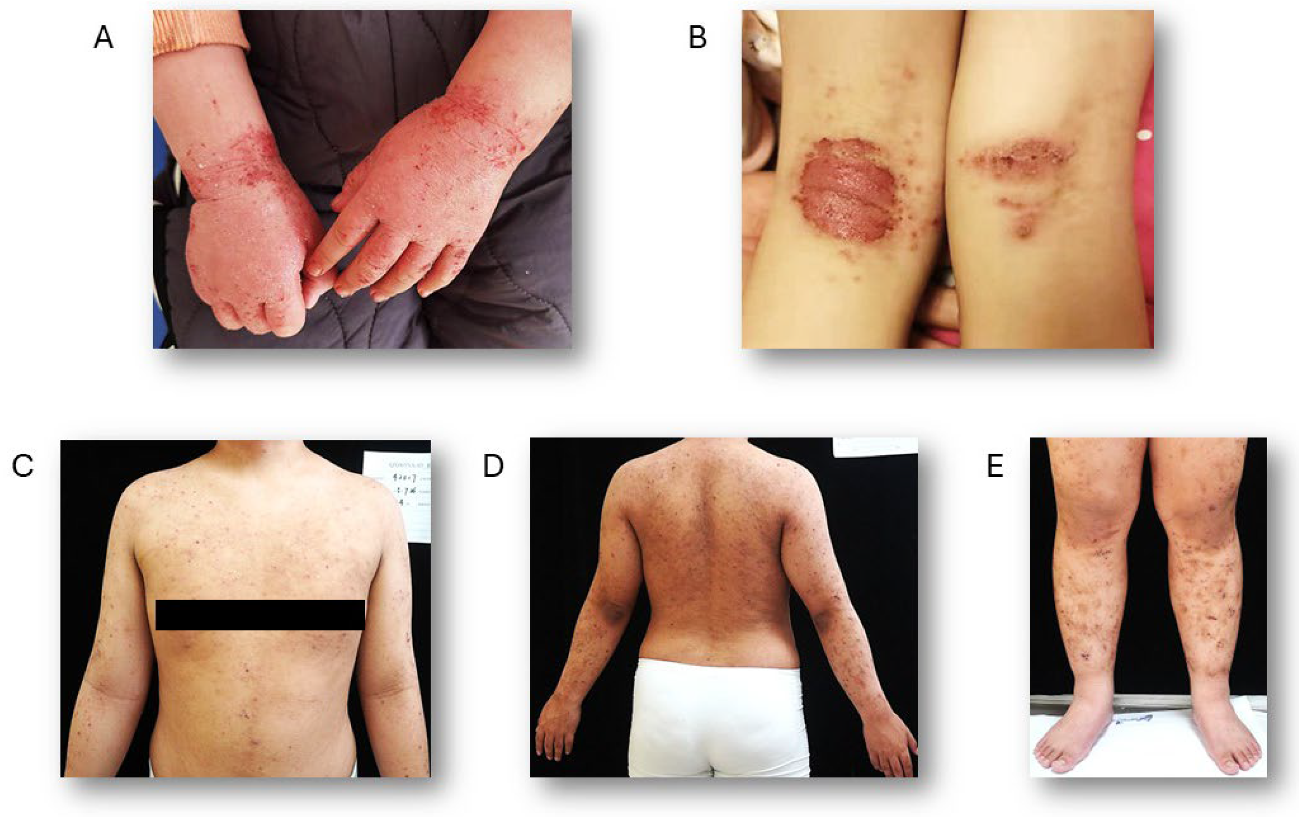 | on six areas (head and neck, trunk, hands, arms, legs and feet | 2 = moderate | ||