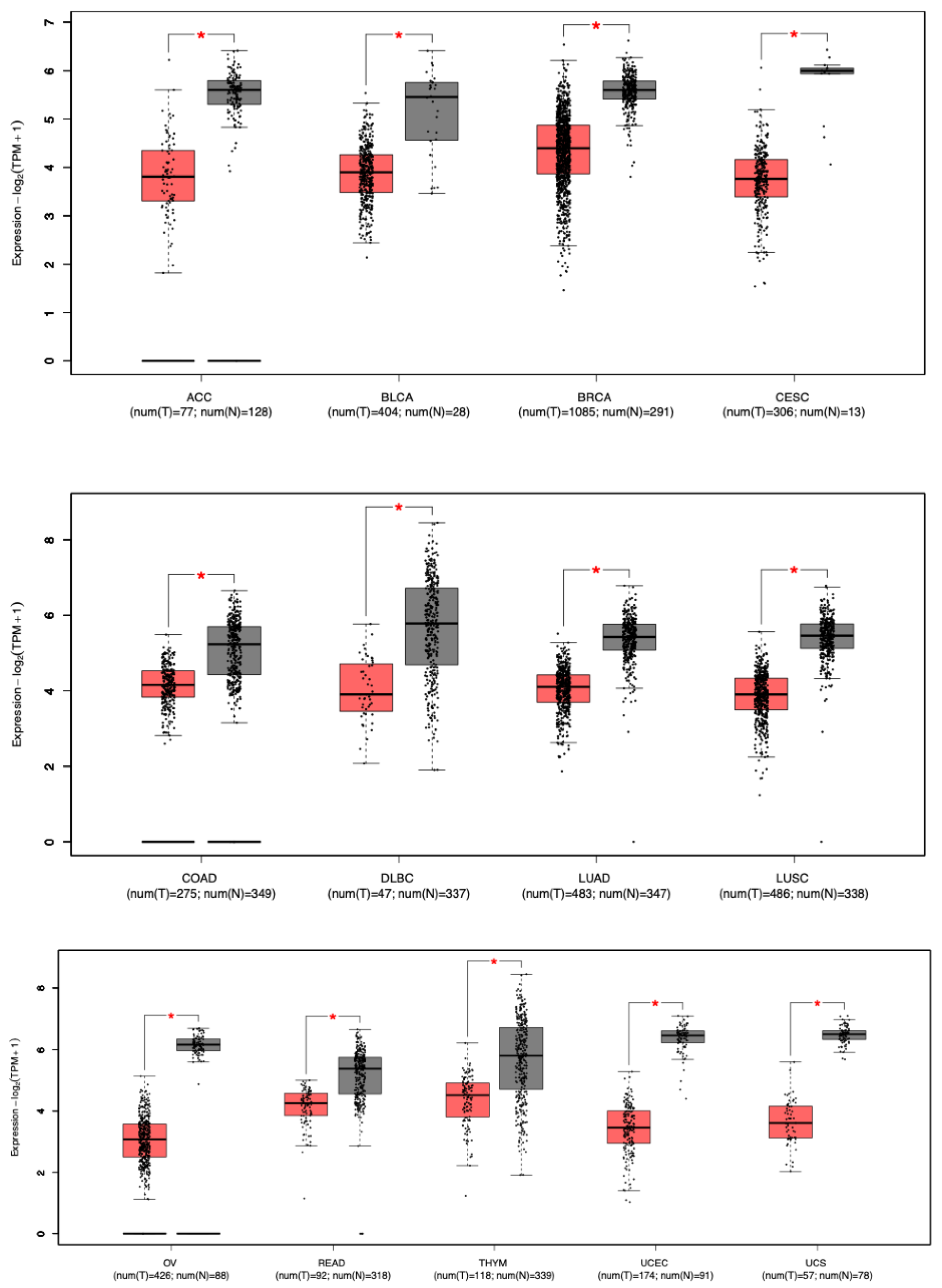 16]. This tool integrates RNA-seq data from The Cancer Genome Atlas (TCGA) tumors and Genotype-Tissue Expression (GTEx) normal tissues, enabling a comprehensive comparison of gene expression across 31 cancer types. Differential expression between tumor tissues and their matched normal counterparts was evaluated using One-way ANOVA, with statistical significance determined by applying the Benjamini–Hochberg correction for multiple testing. The thresholds for significance were set at |log