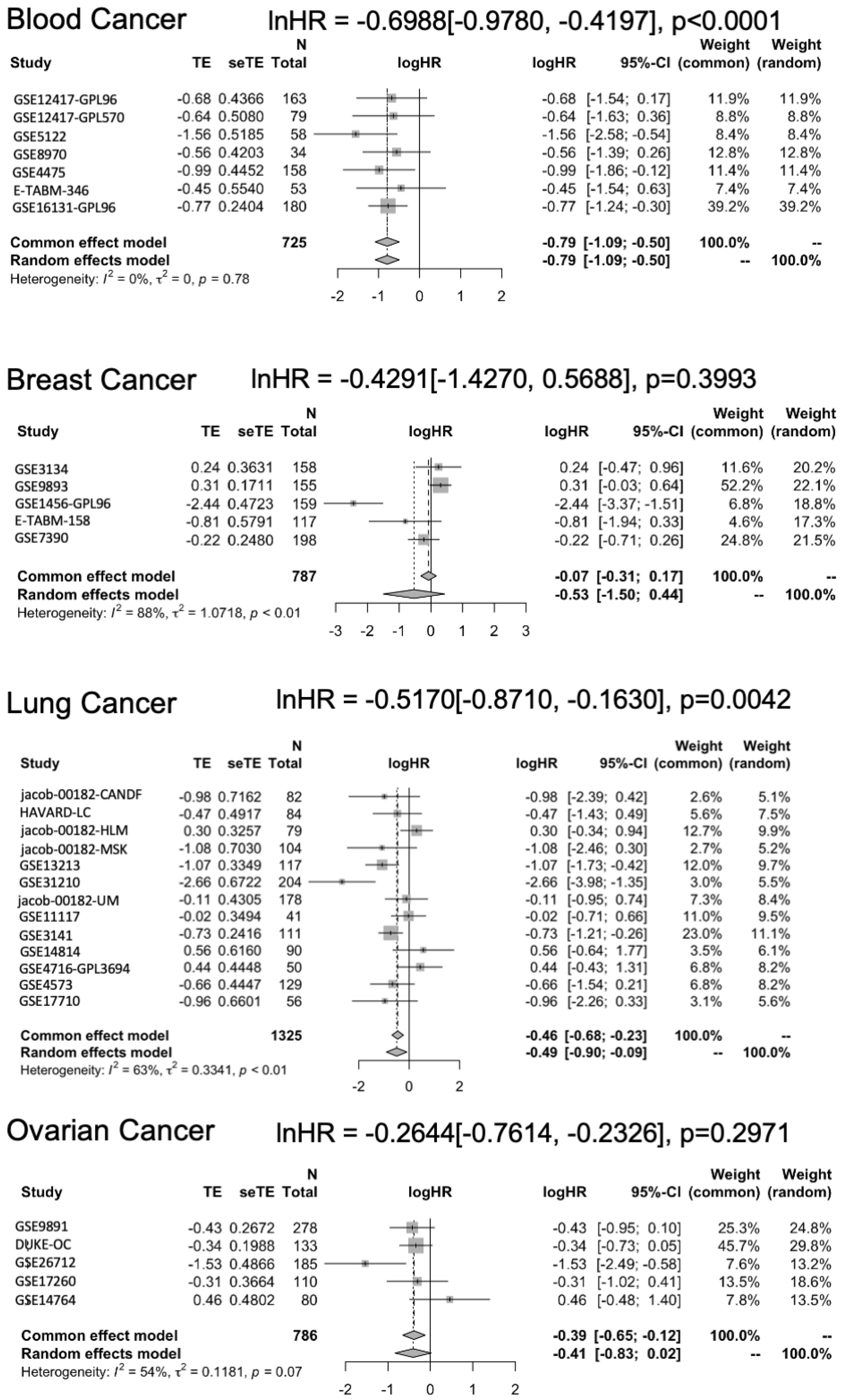 p-value. The final analysis comprised 42 datasets for univariate analysis and 35 datasets for multivariate analysis, the latter including clinical annotations such as age, stage, and grade. Further details are provided in