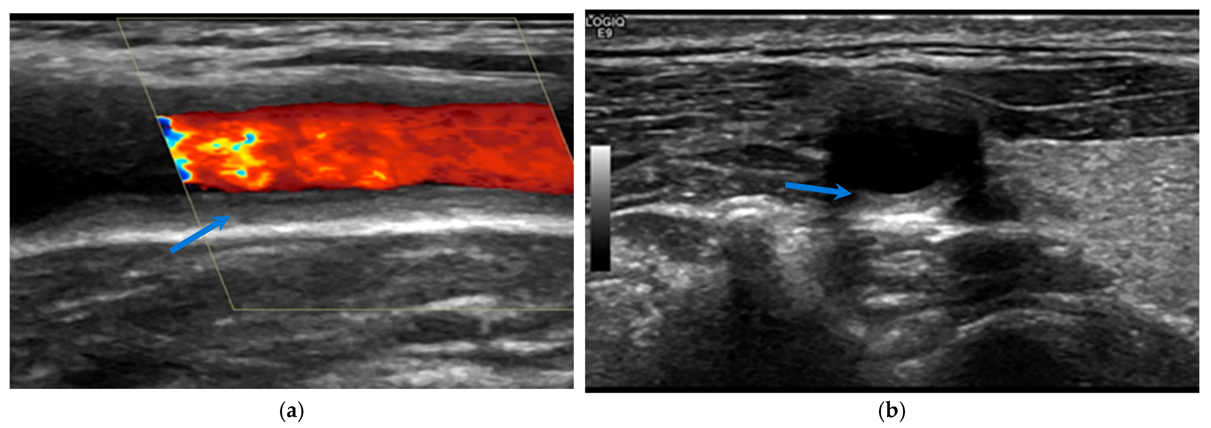 - Maeda, H.; Handa, N.; Matsumoto, M.; Hougaku, H.; Ogawa, S.; Oku, N.; Itoh, T.; Moriwaki, H.; Yoneda, S.; Kimura, K.; et al. Carotid lesions detected by B-mode ultrasonography in Takayasu’s arteritis: “Macaroni sign” as an indicator of the disease. Ultrasound Med. Biol. 1991, 17, 695–701. [Google Scholar] [CrossRef] [PubMed]