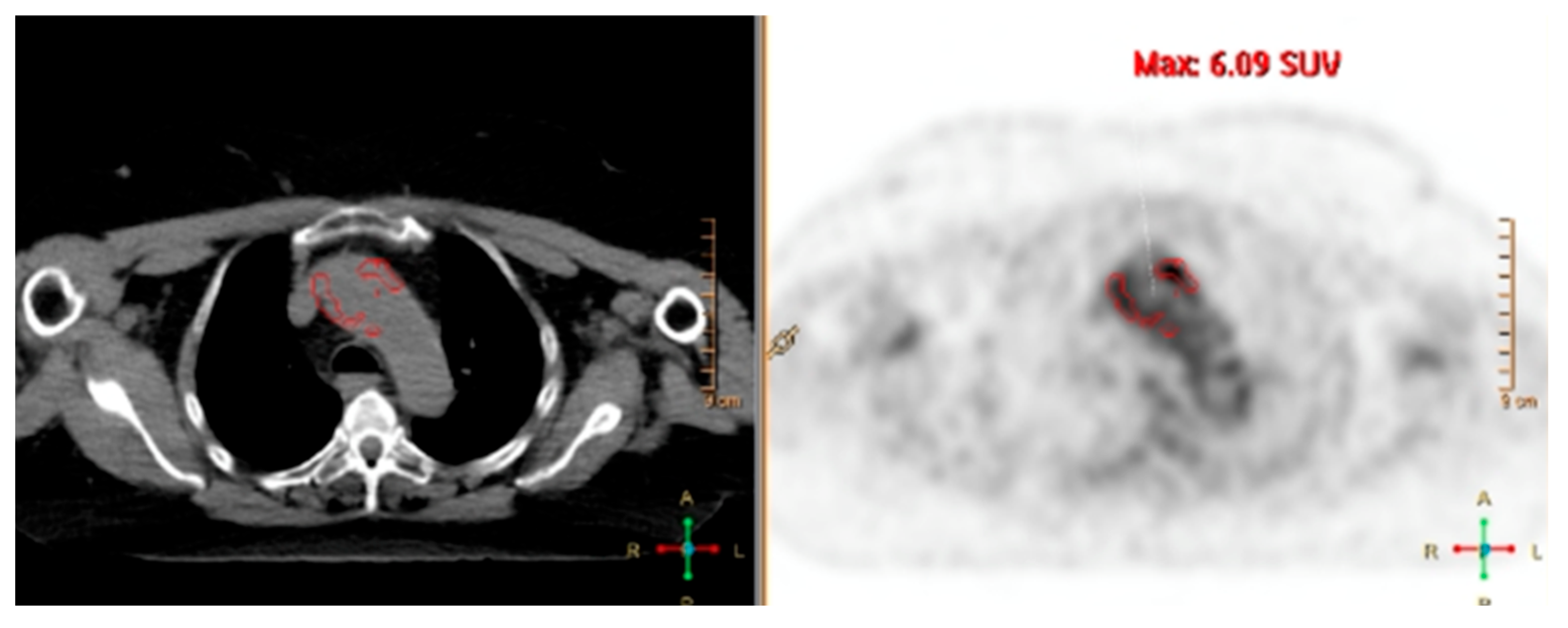 - Quinn, K.A.; Ahlman, M.A.; Alessi, H.D.; LaValley, M.P.; Neogi, T.; Marko, J.; Novakovich, E.; Grayson, P.C. Association of 18F-Fluorodeoxyglucose-Positron Emission Tomography Activity with Angiographic Progression of Disease in Large Vessel Vasculitis. Arthritis Rheumatol. 2023, 75, 98–107. [Google Scholar] [CrossRef]