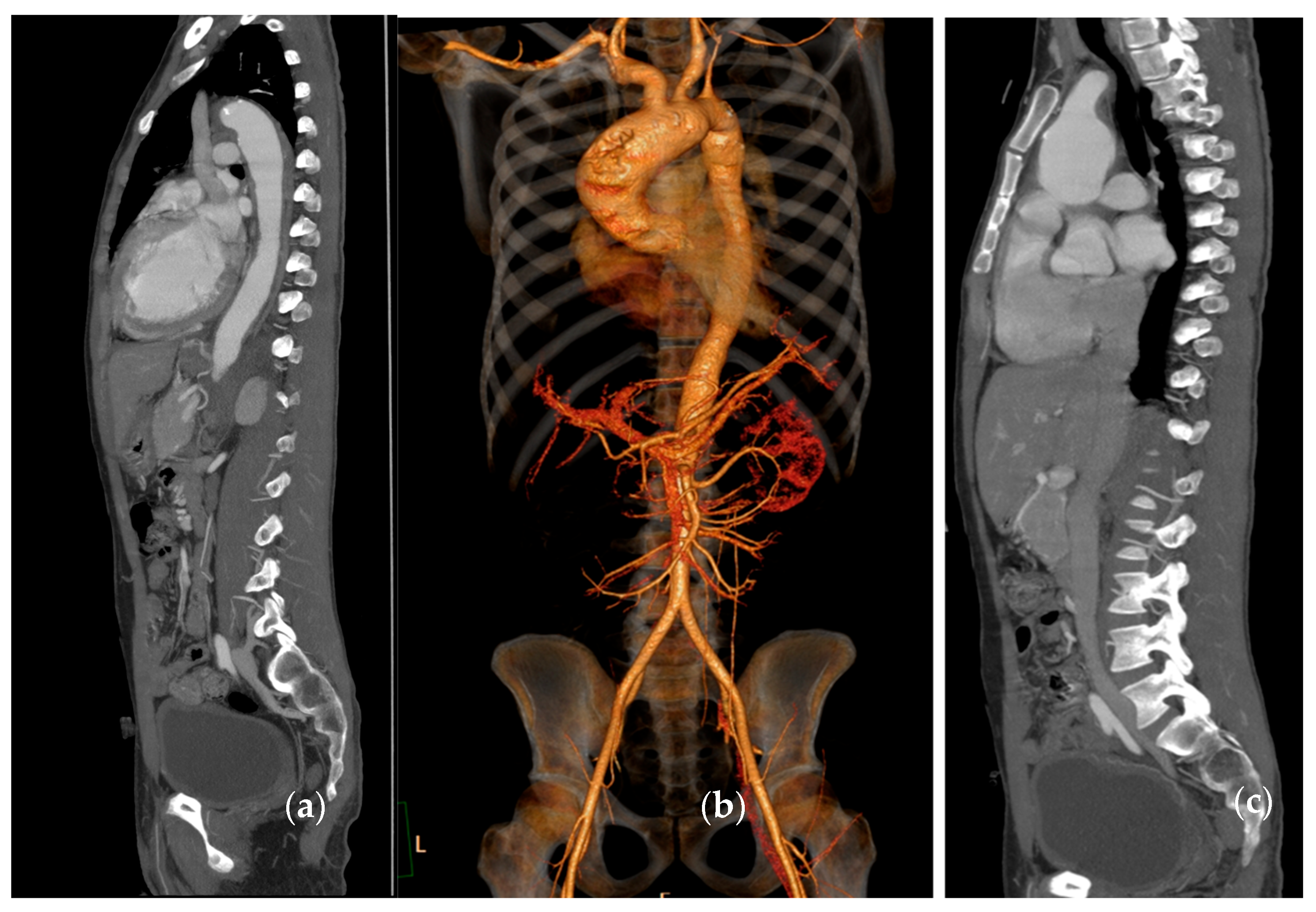 - Sarma, K.; Handique, A.; Phukan, P.; Daniala, C.; Chutia, H.; Barman, B. Magnetic Resonance Angiography and Multidetector CT Angiography in the Diagnosis of Takayasu’s Arteritis: Assessment of Disease Extent and Correlation with Disease Activity. Curr. Med. Imaging 2022, 18, 51–60. [Google Scholar] [CrossRef] [PubMed]