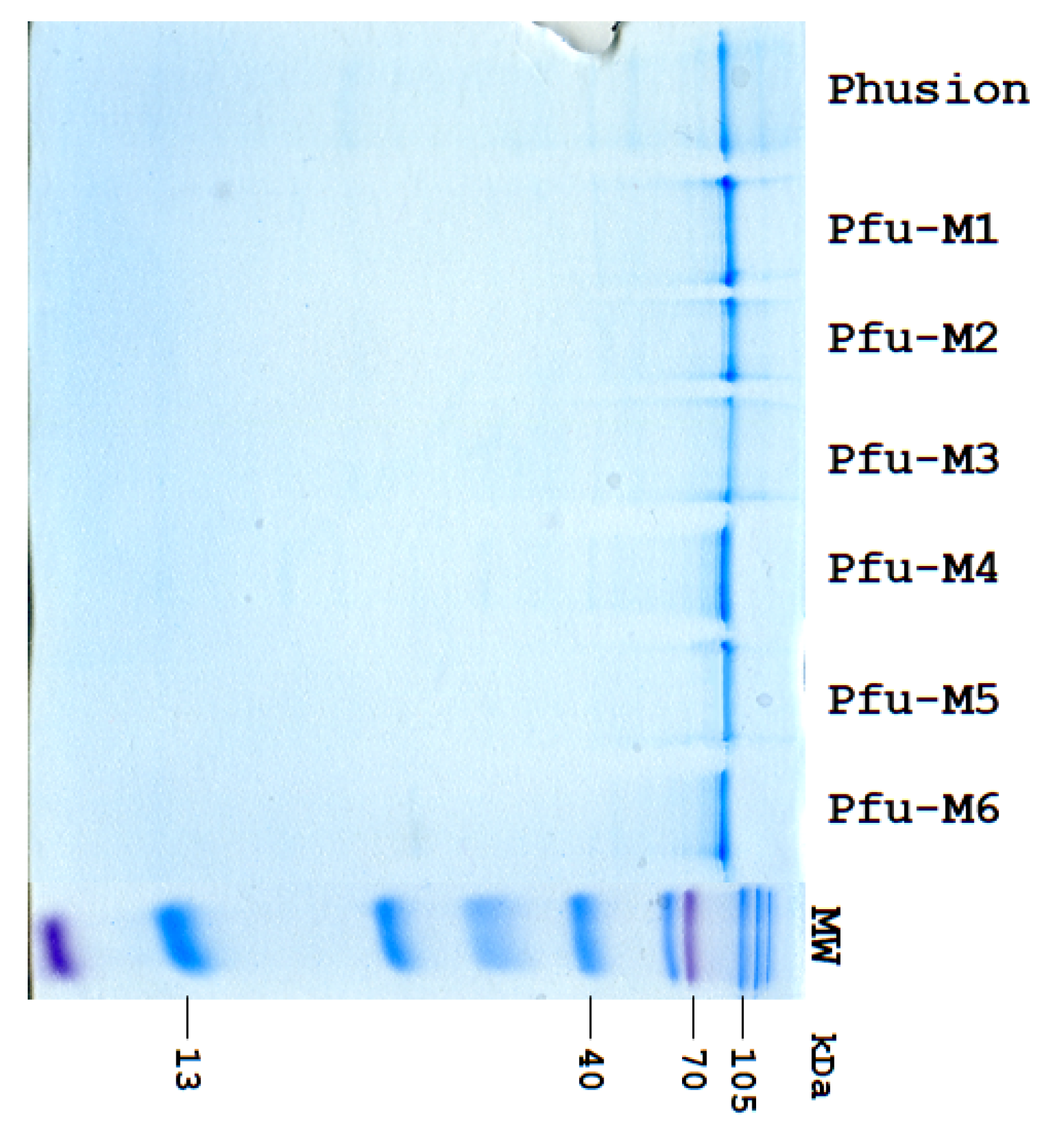 Figure 1. PAGE analysis of protein purity. Lanes: Phusion and Pfu-Mi (i = 1–6), M—Prestained Protein Marker VII (8–195 kDa). Original figures can be found in Supplementary Materials.
