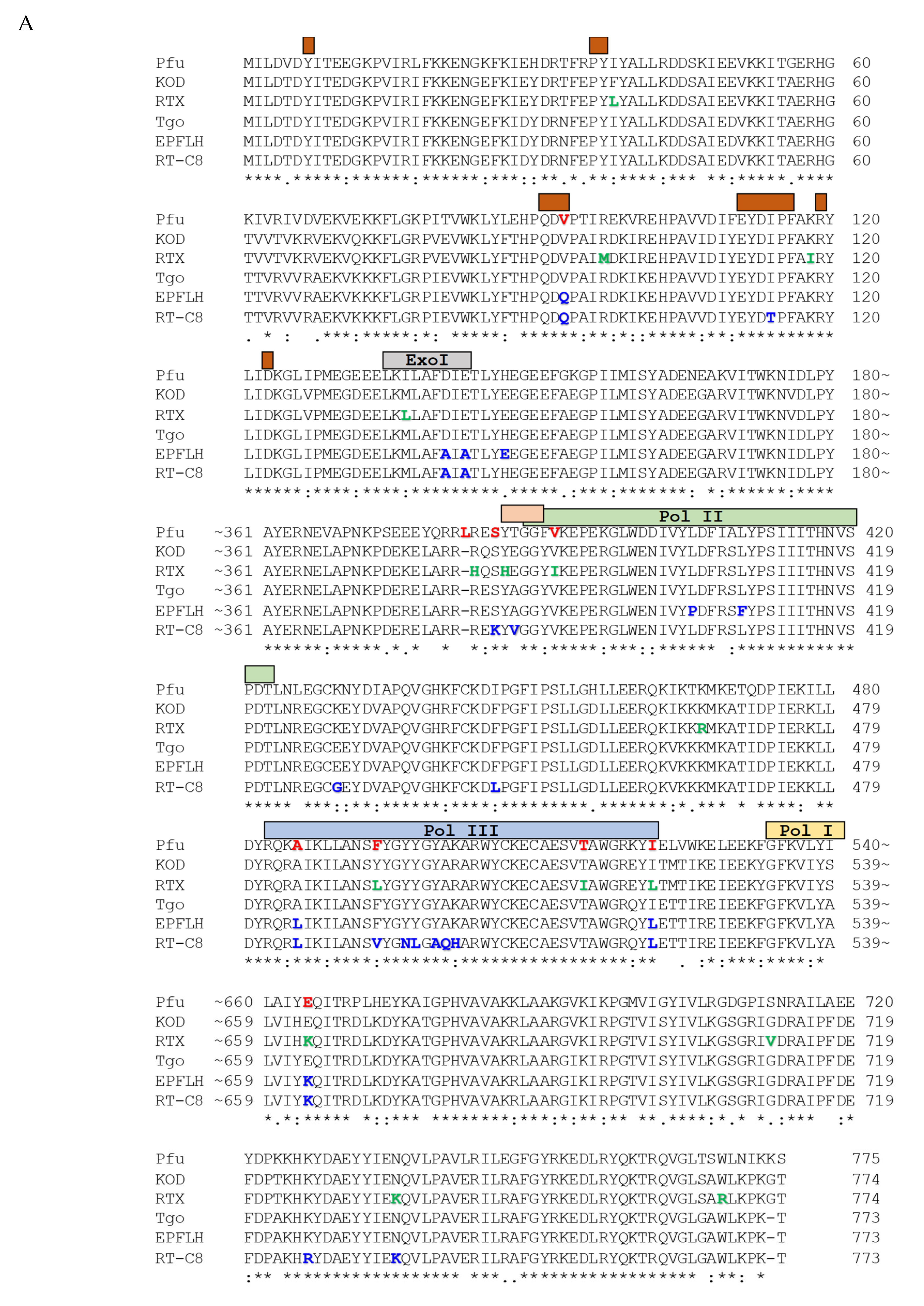 Figure 2. (A) Sequence alignment of Pfu, KOD, RTX [10], Tgo, EPFLH [25], and RT-C8 [9] enzymes. The amino acid residues of the KOD sequence whose replacement led to the appearance of RT properties in RTX-variant are colored in green; for Tgo mutant forms, they are colored in blue. The selected for substitution residues for Pfu are colored in red. The symbols are shown below each line of the alignment, denoting the degree of conservation observed in each column: “*” indicates fully conserved residues, “:” indicates conservation between groups of strongly similar properties, “.” indicates semi-conservative residues. Conserved regions of family B DNA polymerases are highlighted: Pol I through Pol III—yellow, green and blue rectangles, respectively; Exo I is gray rectangle; U-binding pocket including amino acid residues 7; 36–37; 90–93; 111–116; 119; 123 is highlighted by brown rectangles; Y-G(G/A) DNA-binding motif is highlighted by beige rectangle. (B) Structure of binary complex of DNA polymerase KOD from Thermococcus kodakarensis with dsDNA (Protein Data Bank [PDB] ID: 4K8Z) with marking amino acid residues selected for substitutions. The single polypeptide chain of 775 amino acids is folded into five distinct structural domains: the N-terminal domain (cyan, amino acid residues 1–130, 327–368), the 3′→5′ exonuclease domain (yellow, amino acid residues 131–326), the palm domain (green, amino acid residues 369–450 and 501–588), the fingers (gray, amino acid residues 451–500), and the thumb region (blue, amino acid residues 589–775). DNA is highlighted in black. The side chains of the residues selected for substitutions (V93Q, L381H, S384H, V390I, A486L, F494L, T515I, I522L, and E665K) are shown with atoms represented as red ball sticks.