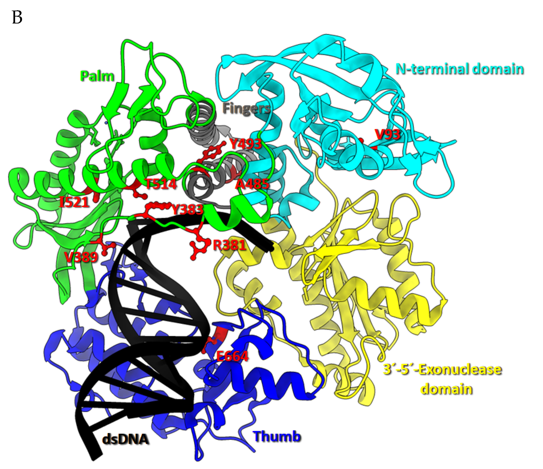 L381HJunction of Palm and 3′-5′ exonuclease domainsBoth residues are located near the template chain and presumably lead to weakening of the binding to the template.