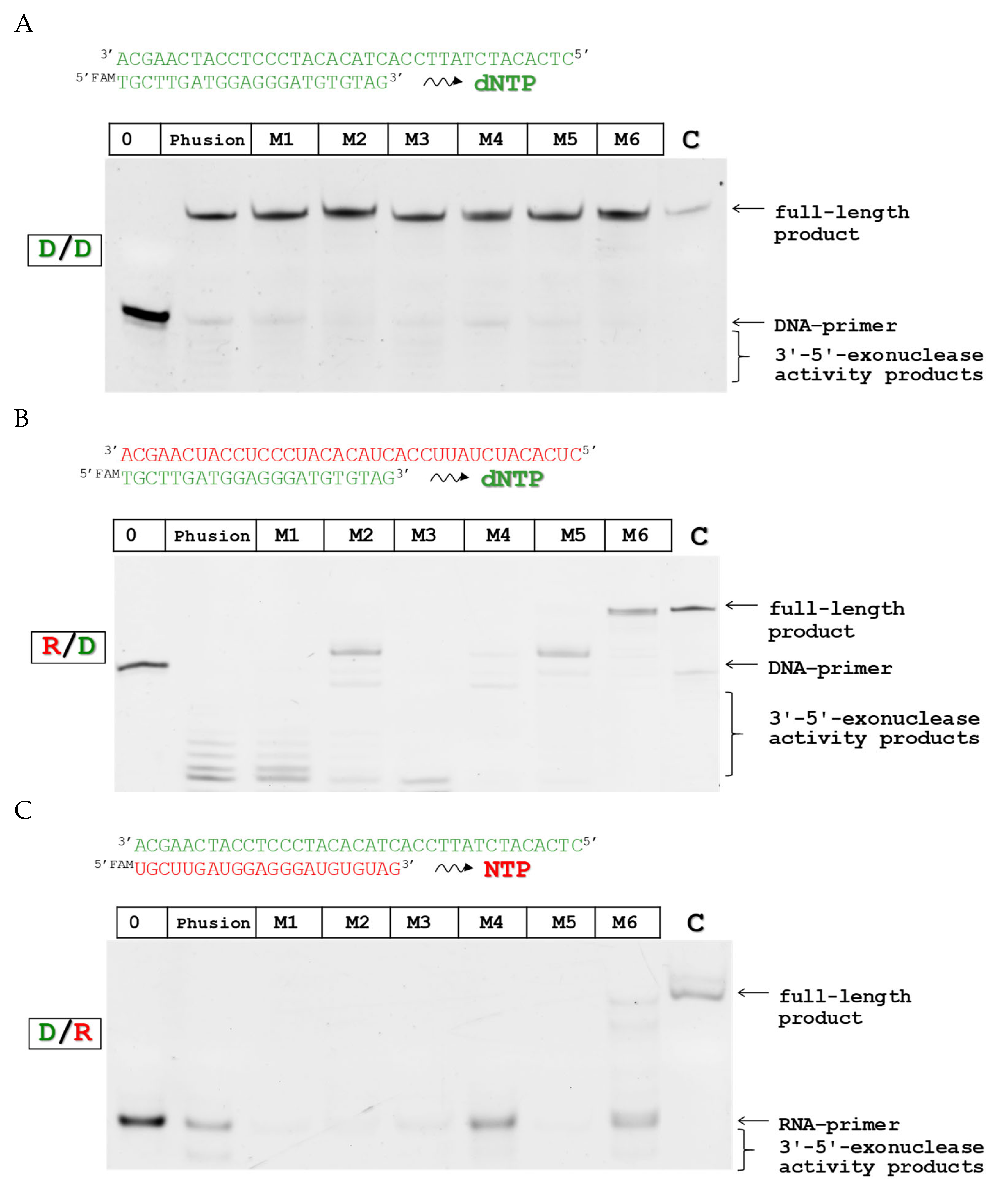 Figure 3. Catalytic activity of mutant forms of Pfu-Mi: (A) DNA-dependent DNA polymerase, (B) RNA-dependent DNA polymerase, and (C) DNA-dependent RNA polymerase. Electropherograms of 15% denaturing PAAG after electrophoretic separation of the polymerase reaction products. Lanes’ designations: “0” represents initial substrate without any treatment; “Phusion” enzyme was used in the reaction as control, “Pfu-M1”-“Pfu-M6” activity of created mutant forms, “C” represents control of the full-size product. The color code for primer and template chains is used: green for DNA and red for RNA. Original figures can be found in Supplementary Materials.