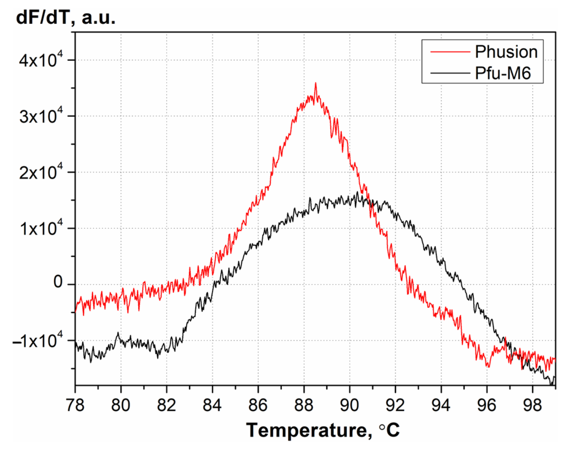 The thermal stability of the enzymes, indicated by their melting temperature (Tm), was determined by Differential Scanning Fluorimetry (DSF). This technique monitors the fluorescence of a dye that binds to hydrophobic protein regions exposed during thermal denaturation [32,33]. Because the wild-type Pfu polymerase is extremely stable and does not fully denature at 100 °C, guanidinium hydrochloride was added to facilitate unfolding [32]. The first derivative curves of melting profile are shown in Figure 4. Analysis of the melting profiles revealed that the mutant Pfu-M6 had a Tm of 88.8 ± 0.4 °C, which is not significantly different from the original Phusion enzyme’s Tm of 88.4 ± 0.3 °C under the same conditions.