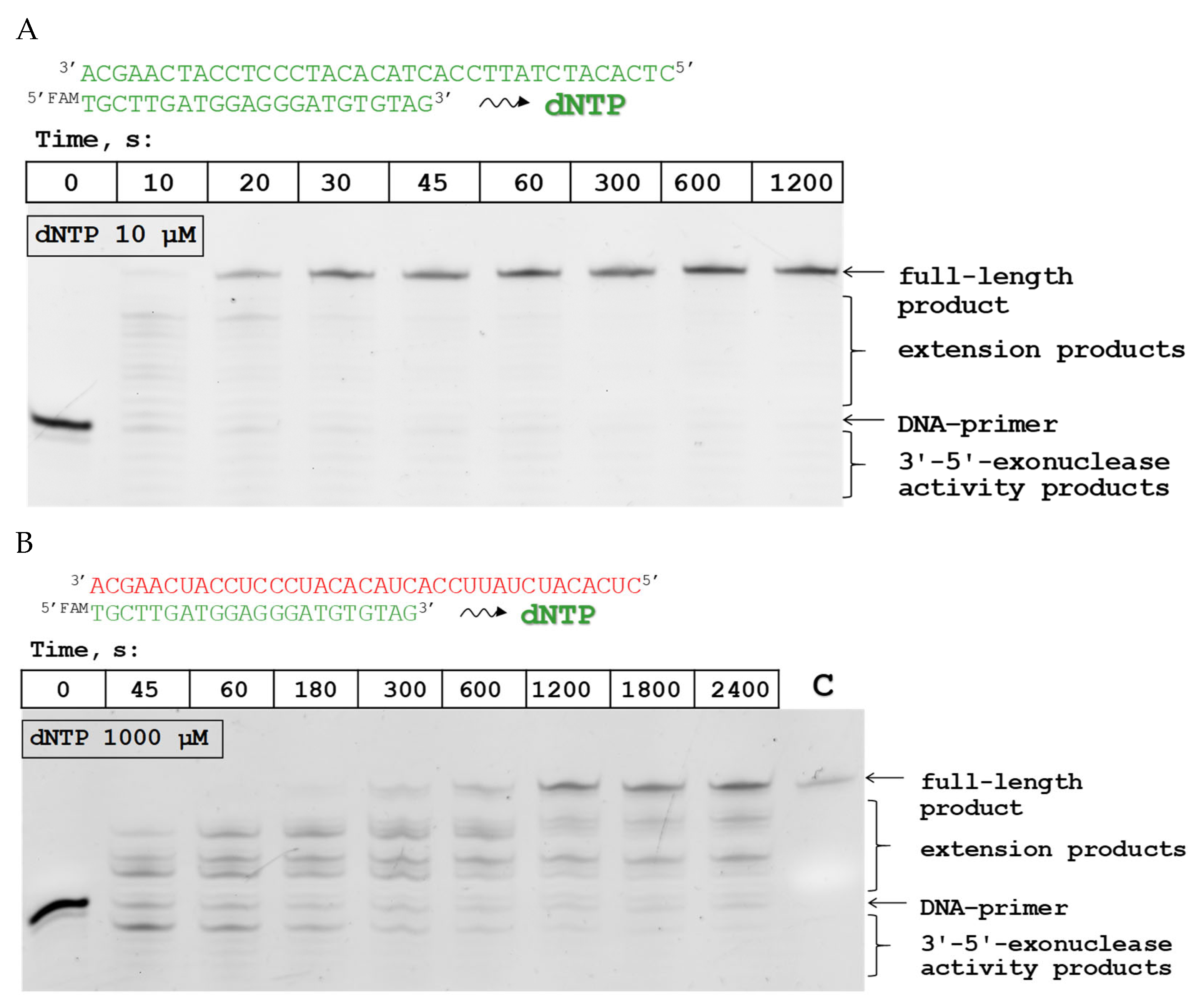 Figure 5. DNA primer elongation under the interaction of Pfu-M6 with the D/D- (A) and R/D-substrates (B) at 37 °C. Reaction conditions are given in Section 2. “C” represents control of the full-size product (37-mer oligoribonucleotide RNAtemp37_Contr). The color code for primer and template chains is used: green for DNA and red for RNA. Original figures can be found in Supplementary Materials.