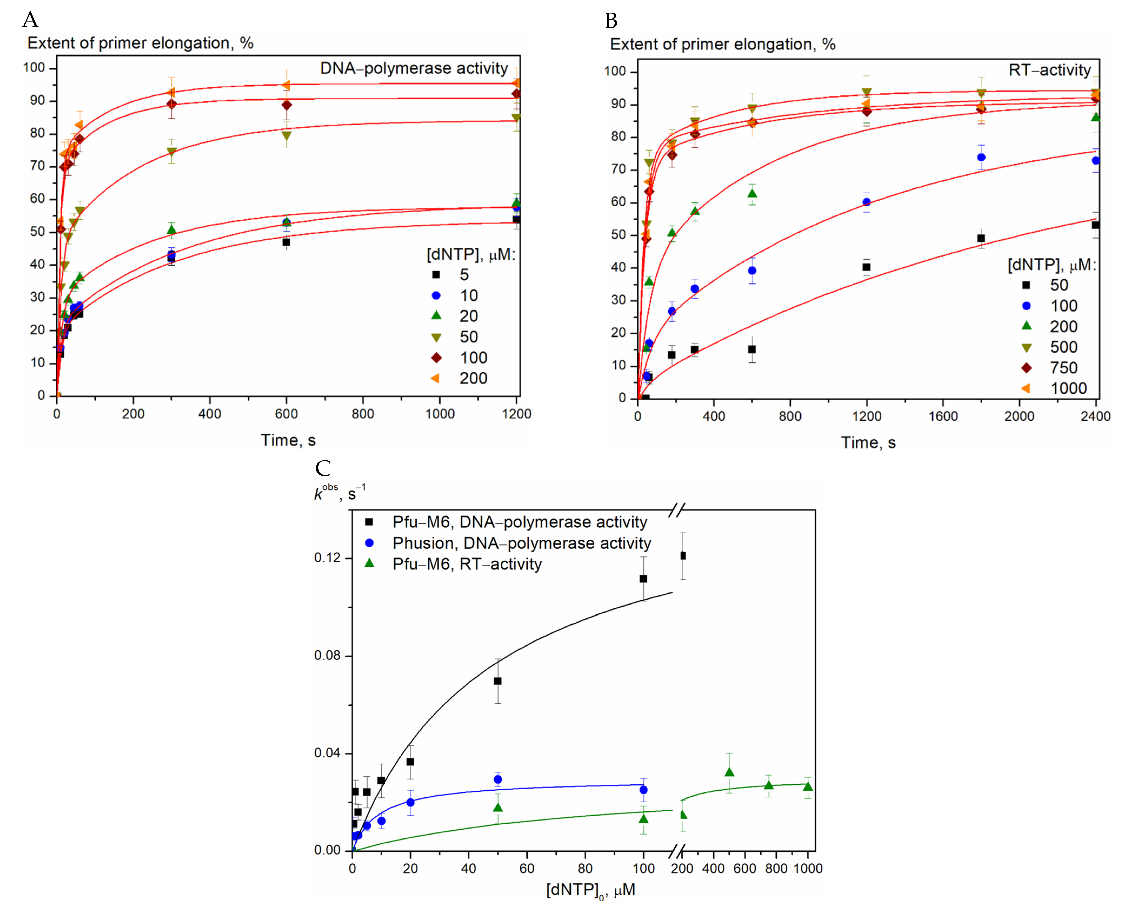 Figure 6. Kinetic curves of the DNA primer extension under the interaction of Pfu-M6 with the D/D- (A) and R/D-substrates (B) at 37 °C. Dependence of the observed rate constant kobs on the dNTP concentration (C).