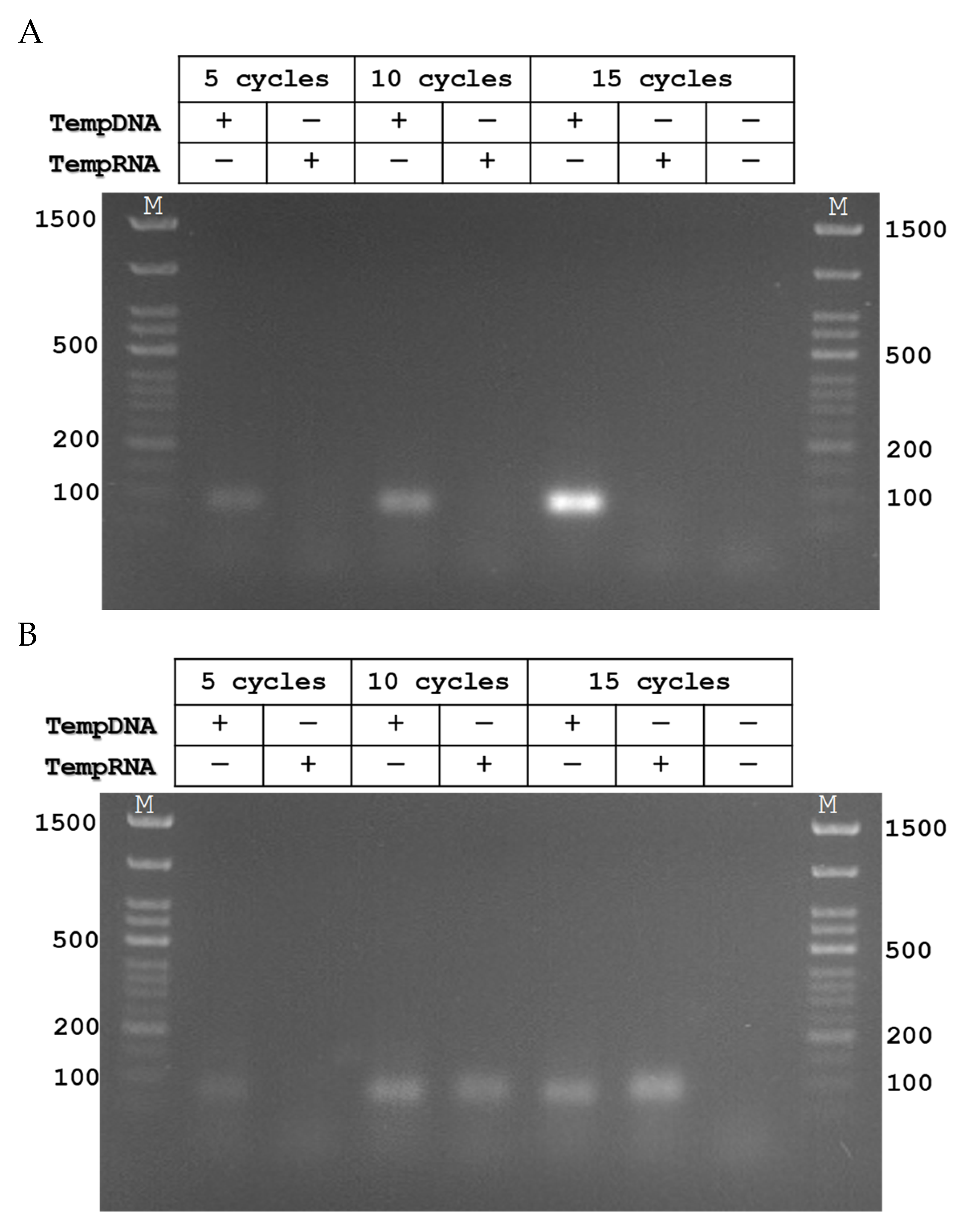 Figure 7. Catalytic activity of Pfu-M6 under PCR conditions. (A) Amplification of TempDNA/TempRNA template with dNTP mix by Phusion. (B) Amplification of TempDNA/TempRNA template with dNTP mix by Phu-M6. PCR products were analyzed using 2% agarose gel electrophoresis. Lane M contains DNA molecular size markers (p Step50 plus, Biolabmix, Novosibirsk, Russia). The cycling protocol consisted of one initial denaturation step at 94 °C for 3 min followed by 5/10/15 cycles of 94 °C for 15 s, 50 °C for 15 s, and 72 °C for 15 s. The amount of cycles is indicated along the top of the figure. Original figures can be found in Supplementary Materials.